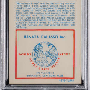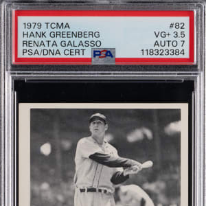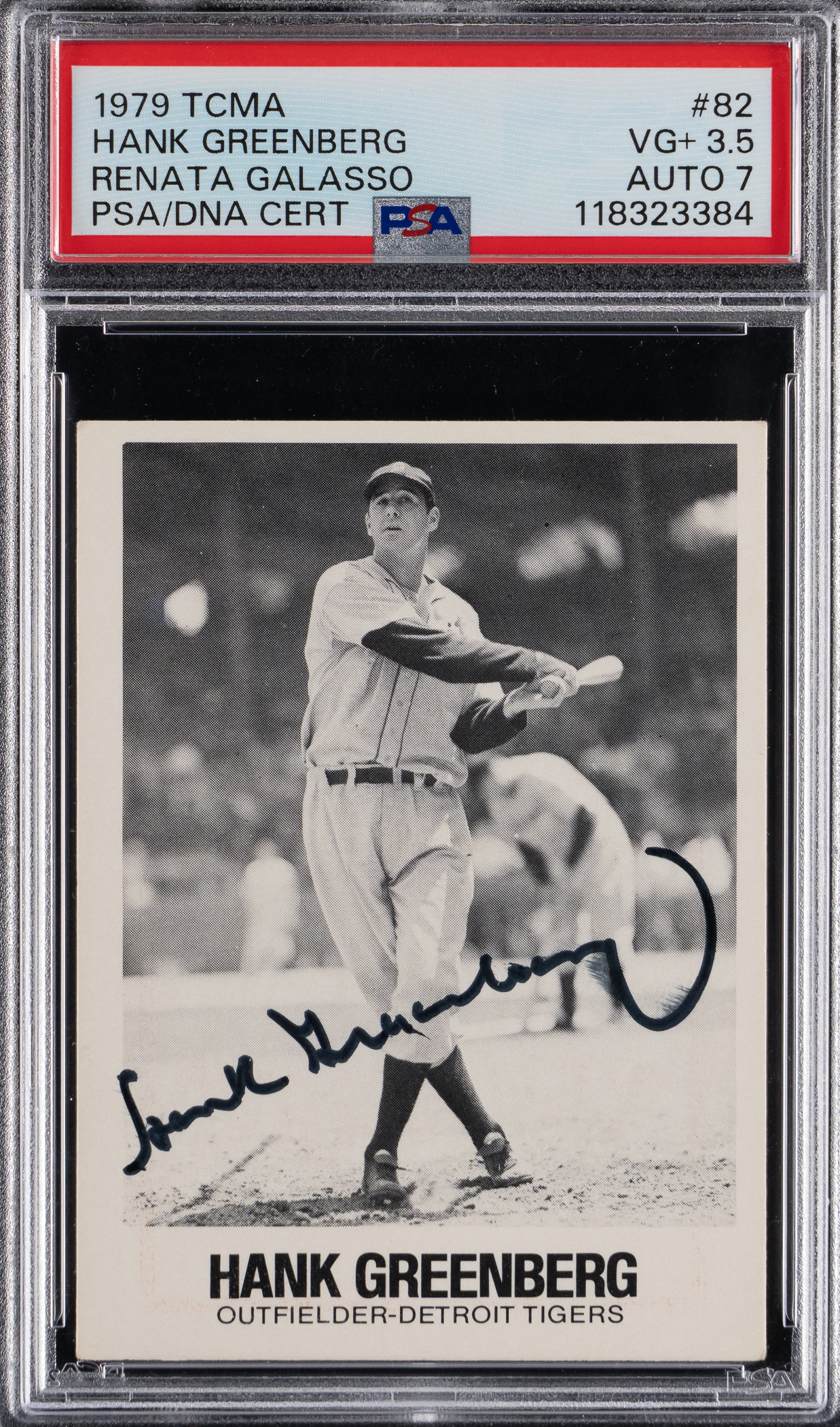 Graded VG+ 3.5 by PSA with a "7" Auto grade. Presented is a 1979 TCMA Renata Galasso #82 single penned by Detroit Tigers Hall of Famer Hank Greenberg in the few years between the card's release and the slugger's September 1986 passing.