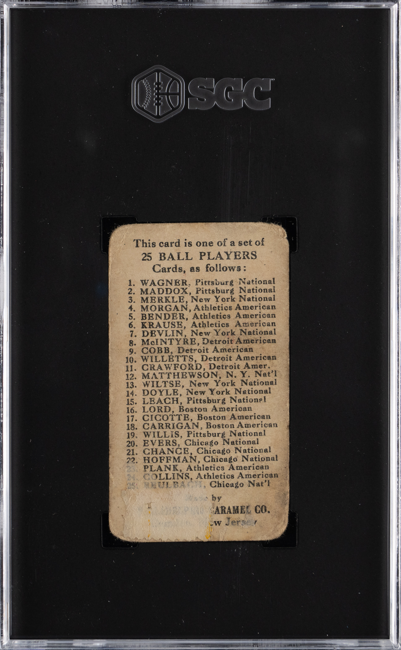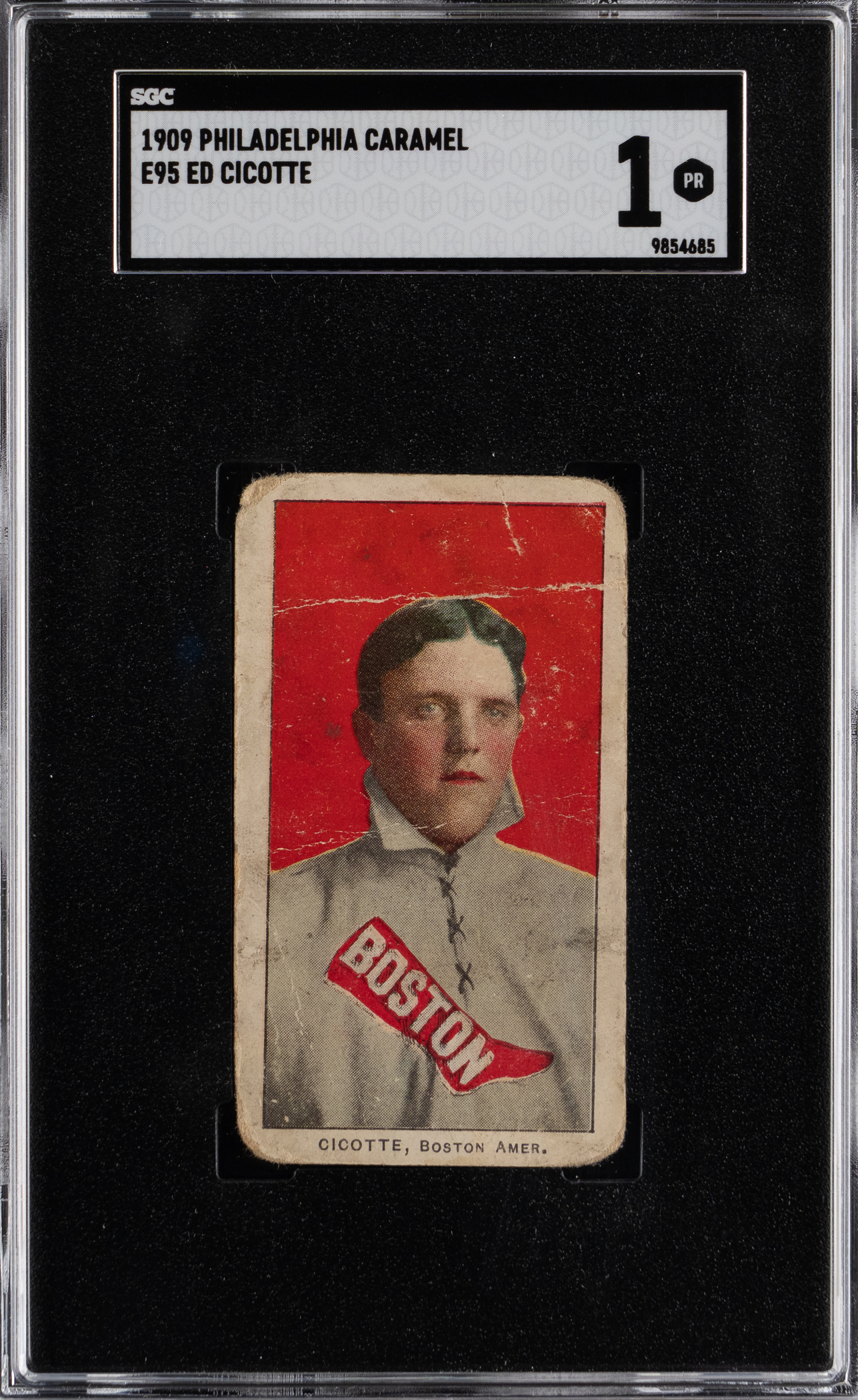 Eight Men Out! Graded POOR 1 by SGC. Eddie (Knuckles) Cicotte who was (in)famously barred for his participation in the 1919 Black Sox Scandal is portrayed during better times on the offered 1909 E95 Philadelphia Caramel card.
