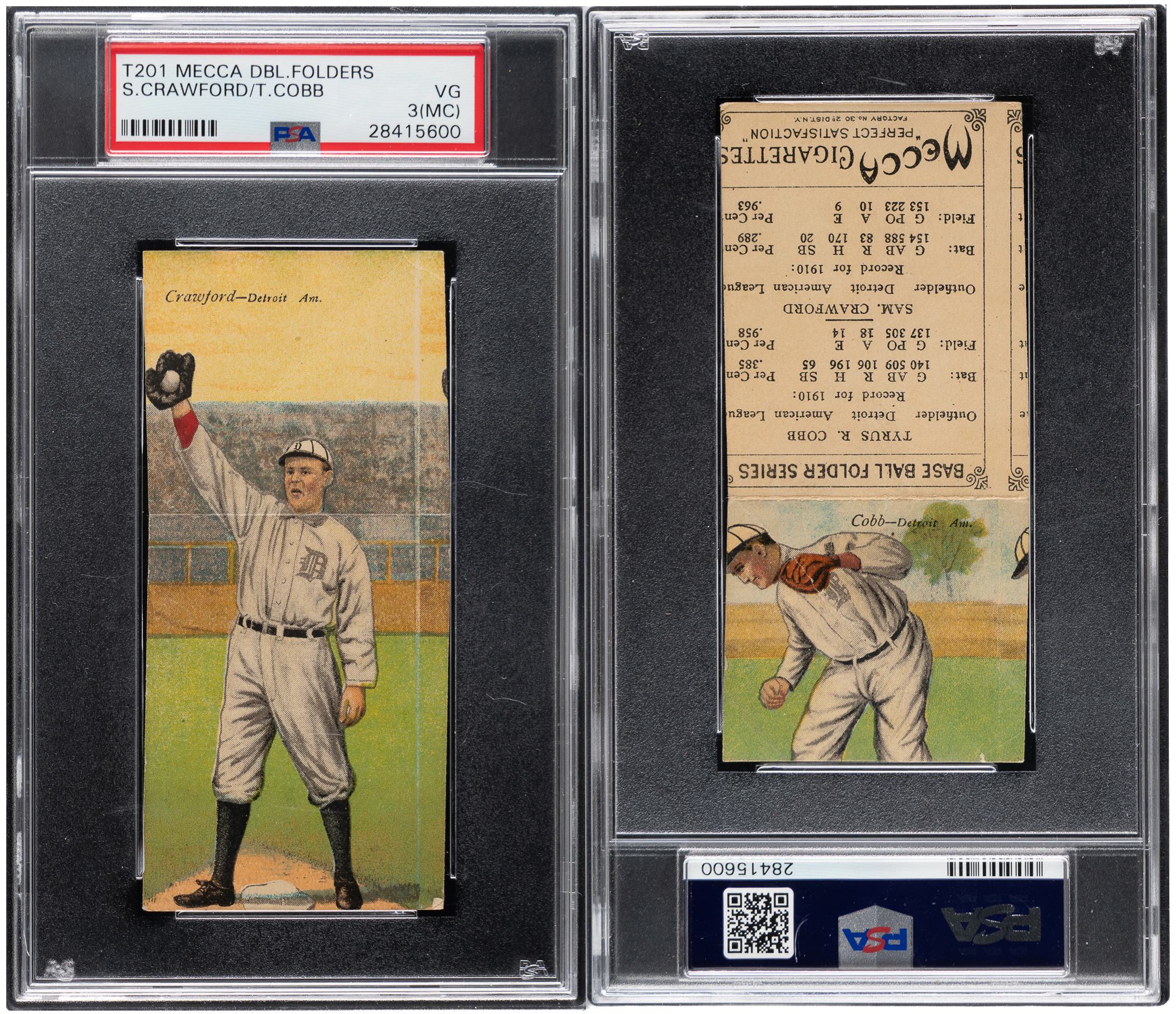 What a Combination! Graded VG 3 by PSA with an (mc) qualifier. The offered 1911 T201 Mecca Double Folder features a pair of Detroit Hall of Fame legends in Ty Cobb and Sam Crawford. A colorful 115-year-old relic displaying only mild perimeter wear and factory errant centering inherent with the issue.