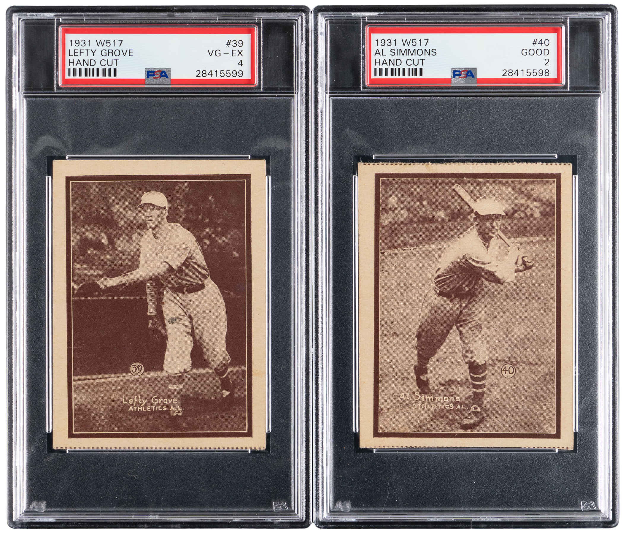 Each graded by PSA. Core members of the early 1930s Philadelphia Athletics juggernaut are profiled with the offered 1931 W517 strip card tandem. The following Hall of Famers were neatly hand cut from a larger strip: 1.) #39 Grove (PSA VG-EX 4) and 2.) #40 Simmons (PSA GOOD 2).