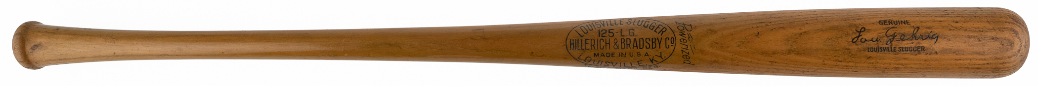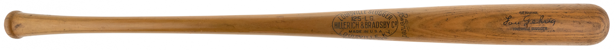 This Louisville Slugger 125-L.G. Lou Gehrig Store Model bat has stampings that are still dark and powerful. The bat still has a nice shine to it, with light overall use. The knob has the stamping “LL 36.” This Lou Gehrig bat is an excellent store model example.