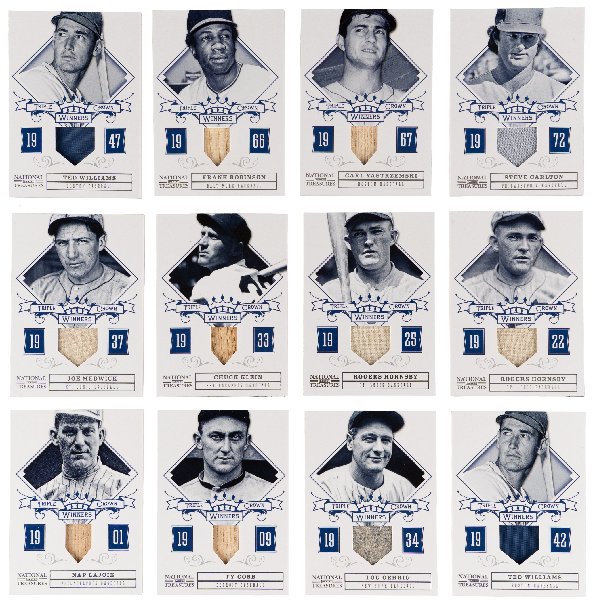 Each serially numbered #/99 or lesser. Those who paced their respective circuit in all three major offensive or pitching categories are recognized with the offered 2012 Panini National Treasures Triple Crown Winners relics partial set of (17/25) modern inserts. Includes: #/99: (12 cards) with #1 Lajoie, #2 Cobb, #6 Klein, #7 Gehrig, #8 Medwick, #9 T. Williams, #10 T. Williams, #11 F. Robinson, #12 Yastrzemski, #18 Feller (matches jersey number), #21 R. Johnson, #23 Verlander; #/25: (5 cards) with #3 Hornsby, #4 Hornsby, #19 Newhouser, #20 Carlton and #22 Kershaw (two-color patch).