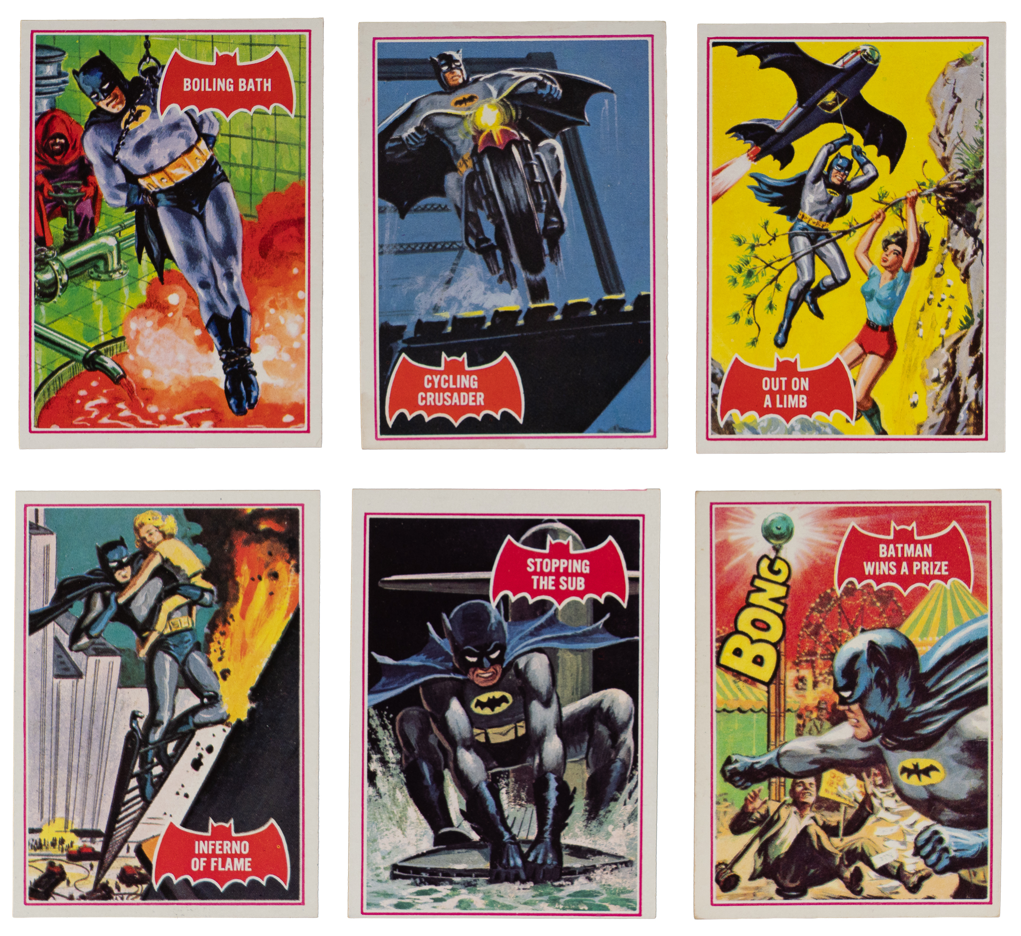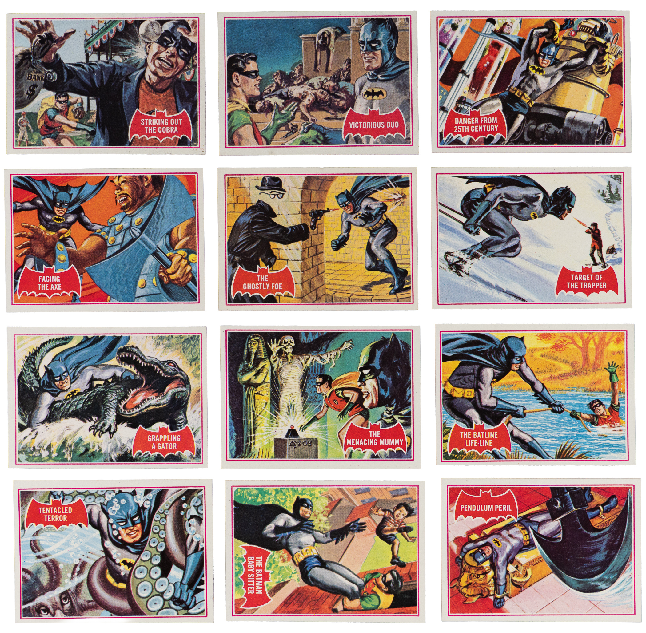 The "Caped Crusader" springs into action with the offered 1966 Topps Batman Red Bat near complete set of (43/44) cards. This entertaining edition generally presents in the (EX to EX-MT) range and is missing only #1 "The Ghostly Foe" for completion.
