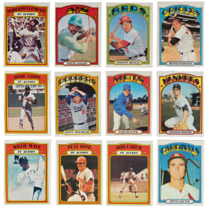 Striking 1972 Topps complete set of (787) cards. This sparkling assembly has an overall approximate condition breakdown of 25% (EX-MT or better), 30% (EX), 25% (VG-EX) and 20% (VG or lesser) with the tougher high series generally presenting on level with the more available numbers. Highlights include: #37 Yastrzemski (EX), #49 Mays (VG-EX), #50 Mays IA (VG-EX), #79 Fisk/Cooper RC (VG), #130 Gibson (EX), #299 Aaron (VG-EX), #300 Aaron IA (VG), #309 Clemente (VG-EX), #310 Clemente IA (VG-EX), #420 Carlton (VG-EX), #433 Bench (VG), #435 R. Jackson (VG-EX), #441 Munson (EX-MT), #445 Seaver (EX-MT), #550 B. Robinson (VG), #559 Rose (EX), #560 Rose IA (VG-EX), #595 Ryan (GD), #600 Kaline (VG-EX), #686 Garvey (NM), #695 Carew (VG-EX), #696 Carew IA (VG), #751 Carlton TRD (GD), #752 Morgan TRD (VG-EX), #754 F. Robinson TRD (VG-EX), #760 Mazeroski (EX), #761 Oglivie/Cey RC (VG) and #777 Wilhelm (EX).