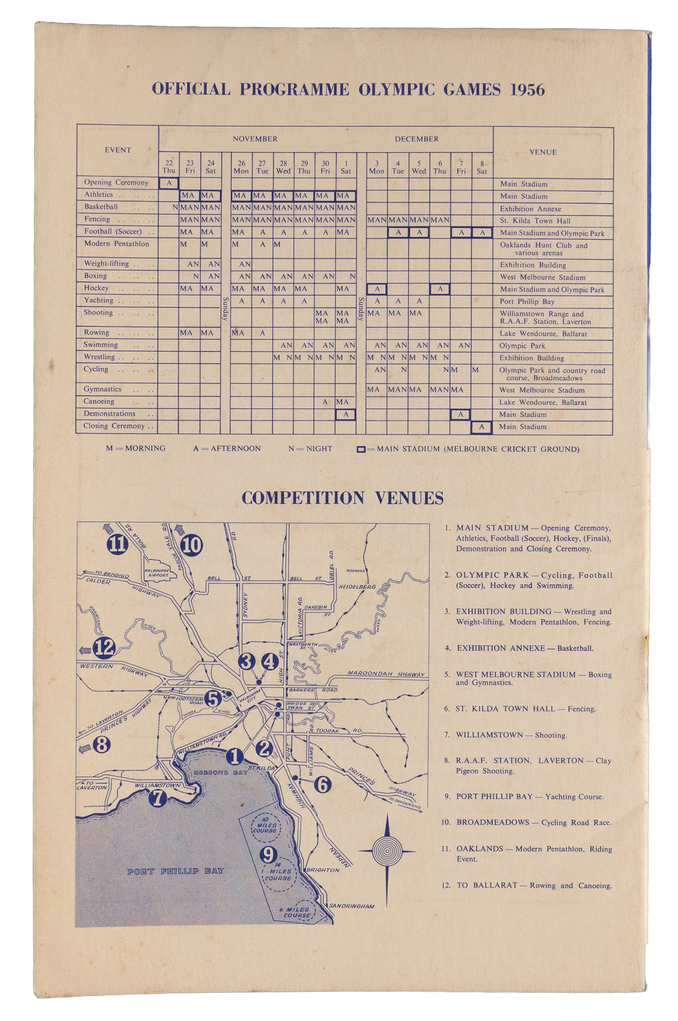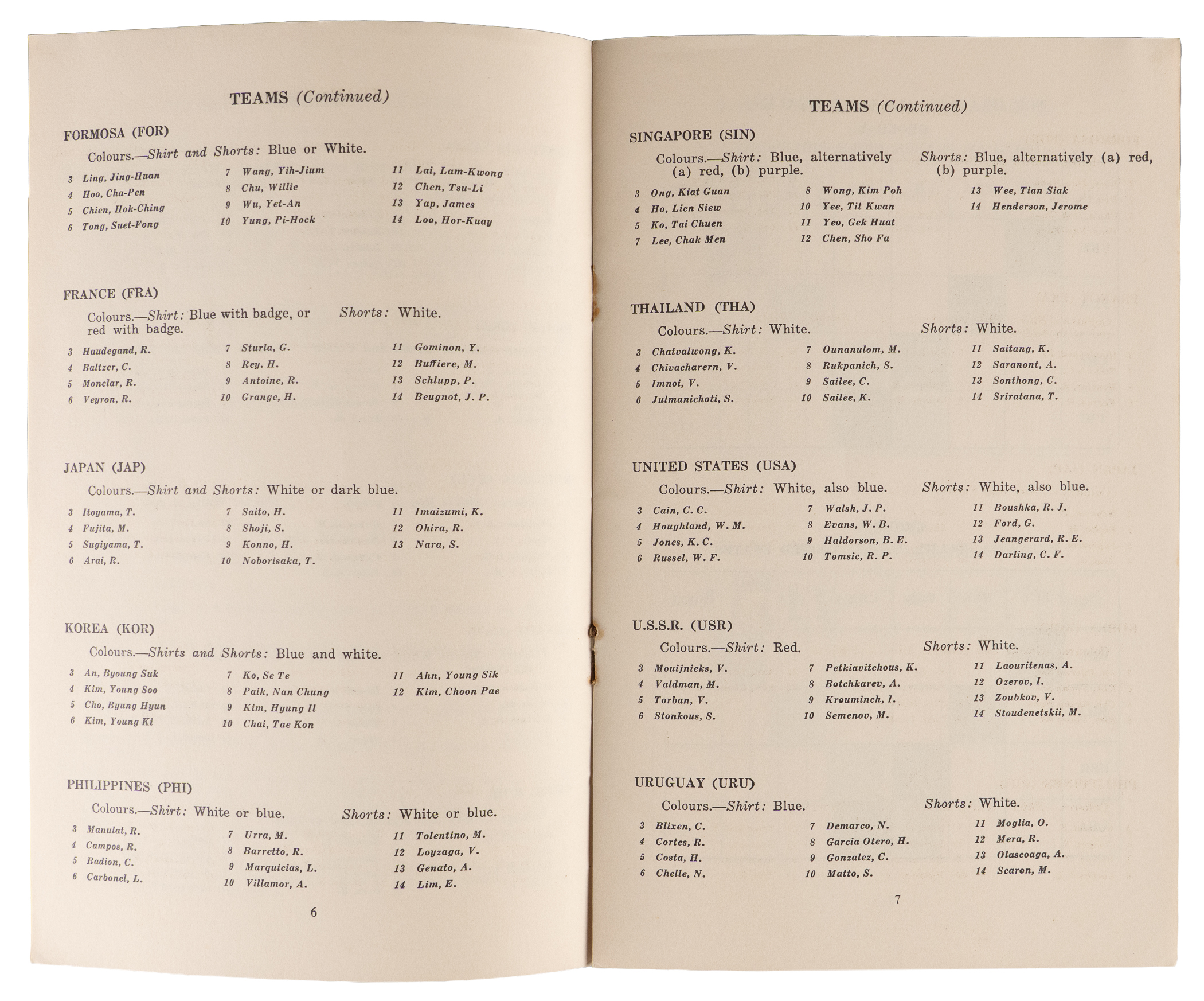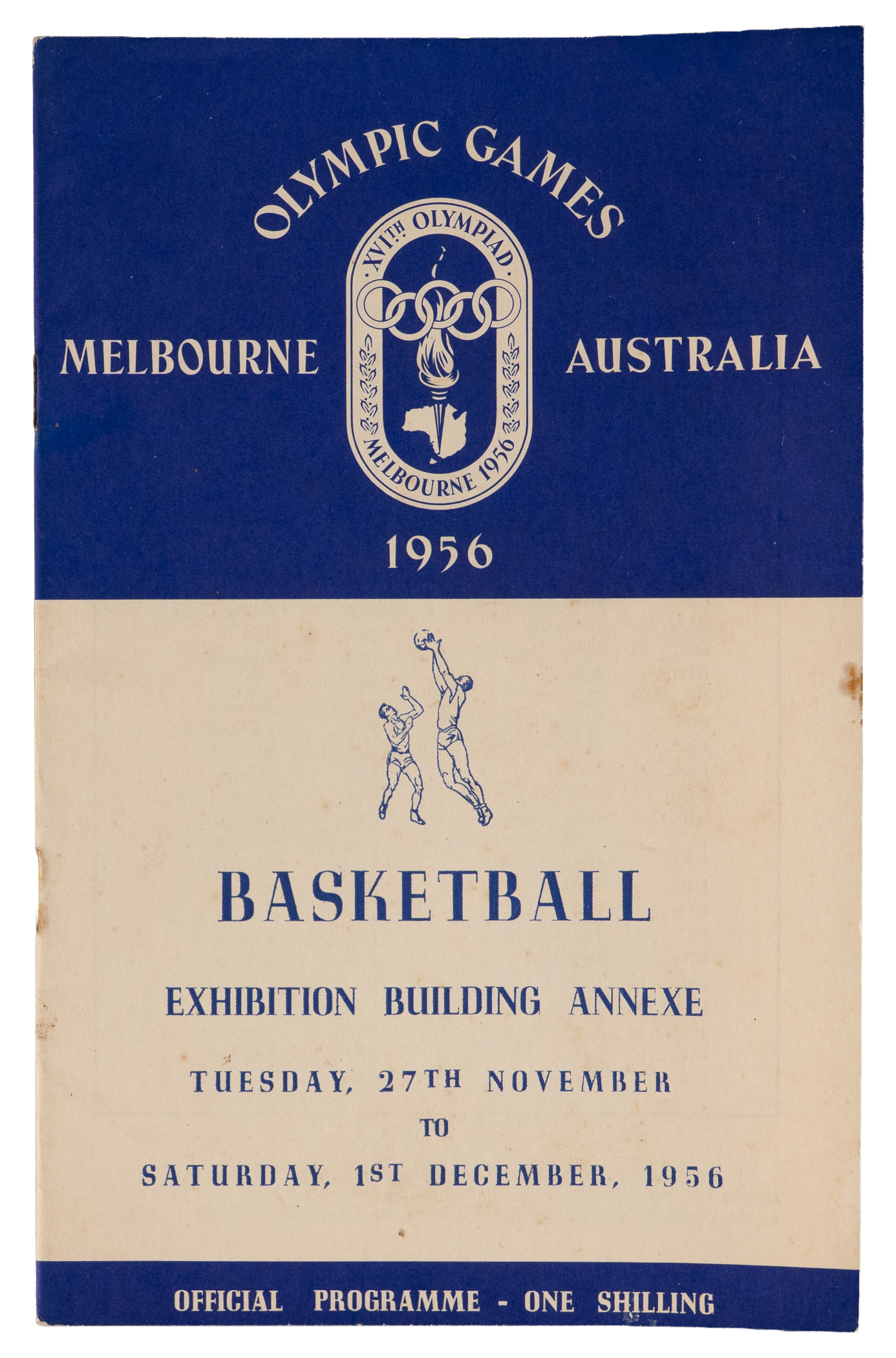 Team USA took home the gold medal in basketball at the 1956 Olympic Games, and here's your chance to take a sweet souvenir from the Melbourne games. Served up is a 1956 Olympic Games official basketball program. There were two big reasons Team USA racked up an 8-0 record at the Melbourne games, the first was Bill Russell, and the other was K.C. Jones. Both celebrated Hall of Famers, these longtime teammates really knew what winning was all about. During their collegiate days at San Francisco, they won back-to-back NCAA championships in 1955-1956. Then they won their gold medals at the 1956 Olympics. After that, they won eight consecutive NBA championships with the Boston Celtics, from 1959-1966. The only that kept them from winning even more, was Jones two years of military service. These remarkable champions are both listed for Team USA in this fairly well-preserved program, which rates as Ex, with boasts a tight spine, clean cover, and supple pages.