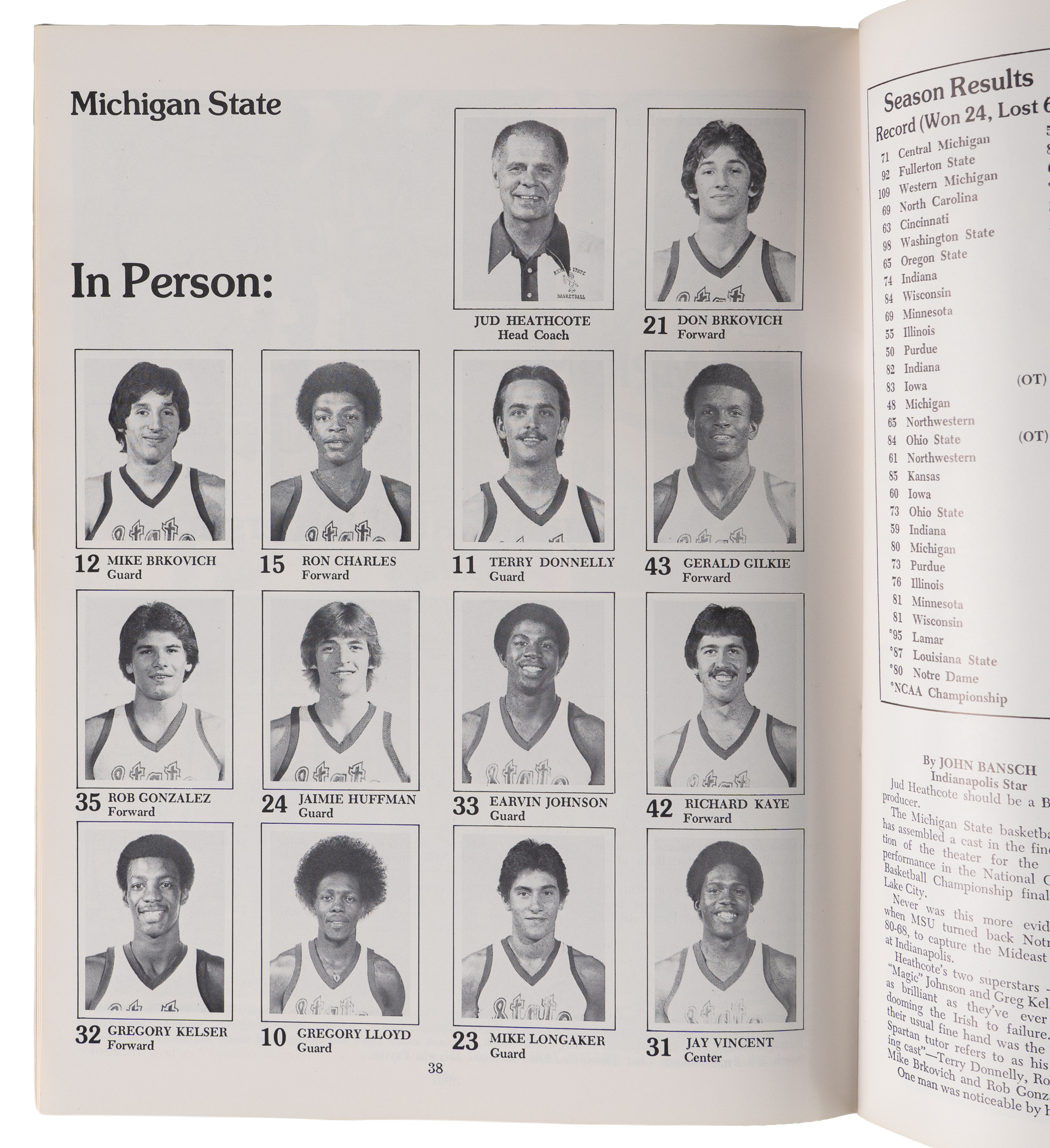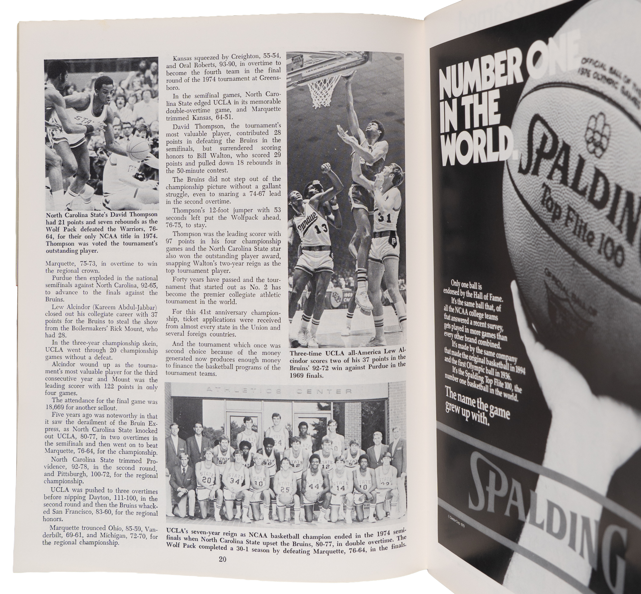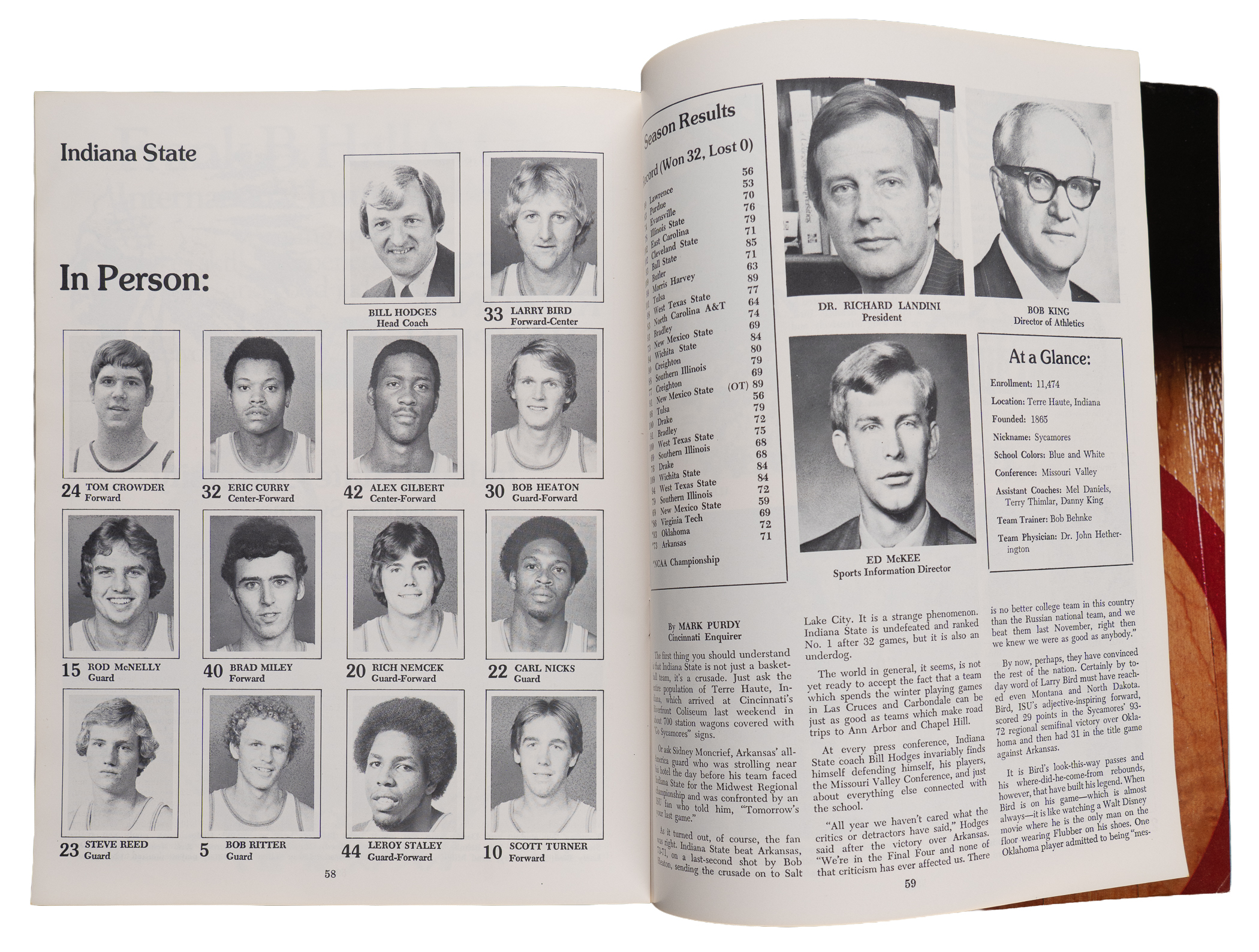 Head to ground zero for one of basketball's greatest rivalries, when you examine this 1979 41st Annual NCAA Basketball Championship program. Issued for the Final Four championship round of the 1979 NCAA Tournament, this nicely preserved program merits an Ex-Mt rating. This Final Four round was staged at the University of Utah, from March 24th to the 26th. The main attractions were Michigan State star Earvin "Magic" Johnson, and Indiana State star Larry Bird, who faced each other in the championship game. Following the Spartan's triumph over the Sycamores, these legendary stars continued their riveting rivalry in the NBA, treating fans to some of the finest basketball play ever seen from 1979-1991.
