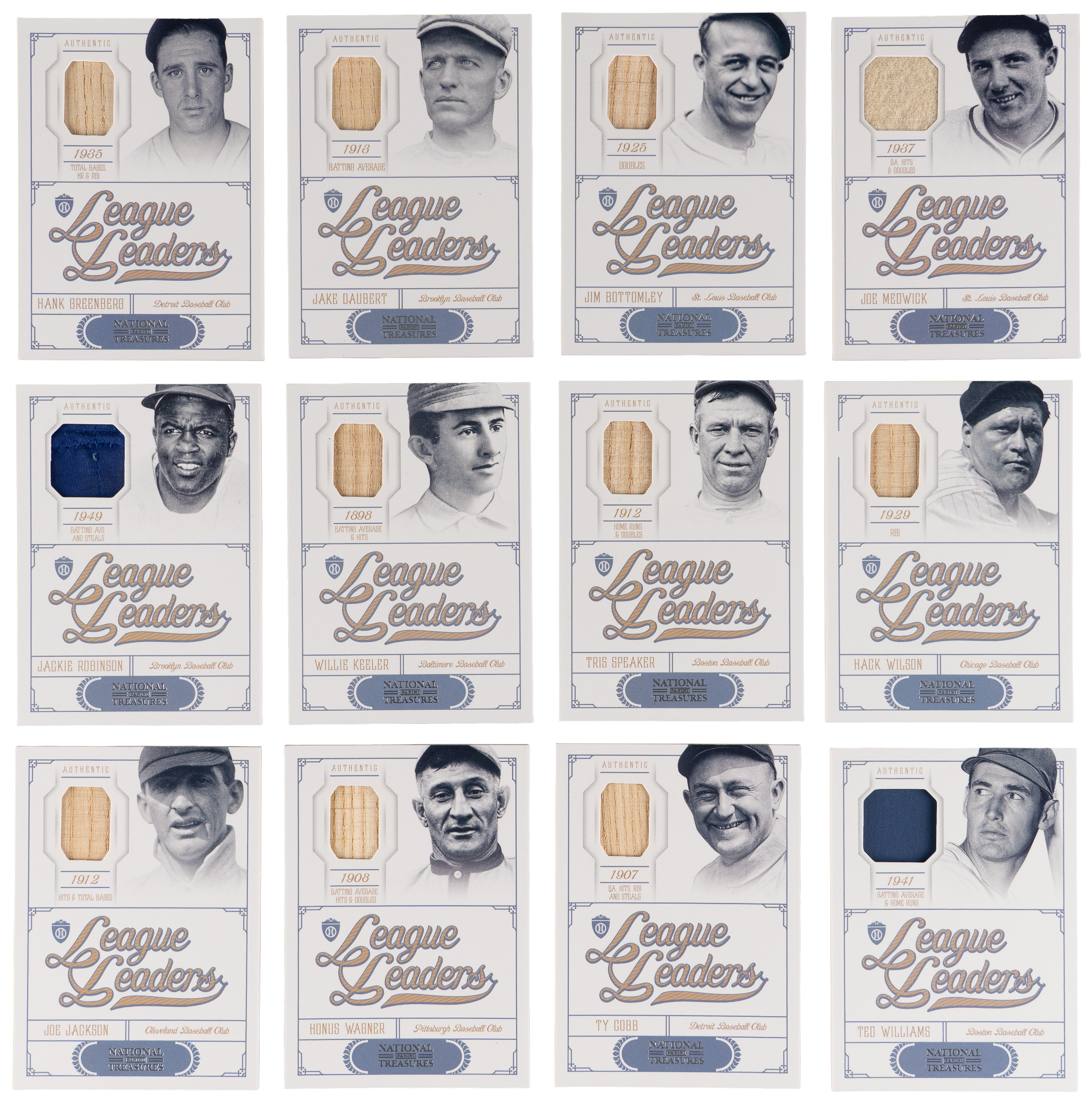 Each serially numbered #/99 or lesser. Those standouts who paced their respective circuit in various offensive categories are the focus of the offered 2012 Panini National Treasures League Leaders Game-Used Relics partial set of (23/30) modern inserts. The following verified lumber slices and uniform swatches are included: #/99: (19 cards) with #2 Cobb, #7 G. Kelly, #9 Heilmann, #10 P. Waner, #12 L. Waner, #13 H. Wilson, #14 Klein, #16 Cronin, #17 Goslin, #18 Herman, #19 Greenberg, #20 Appling, #23 Simmons, #24 T. Williams, #26 J. Robinson, #27 Keeler, #28 Furillo, #29 Speaker, #30 Daubert; #/49: (3 cards) with #4 J. Jackson, #8 Bottomley, #21 Medwick and #/25: #3 Wagner.