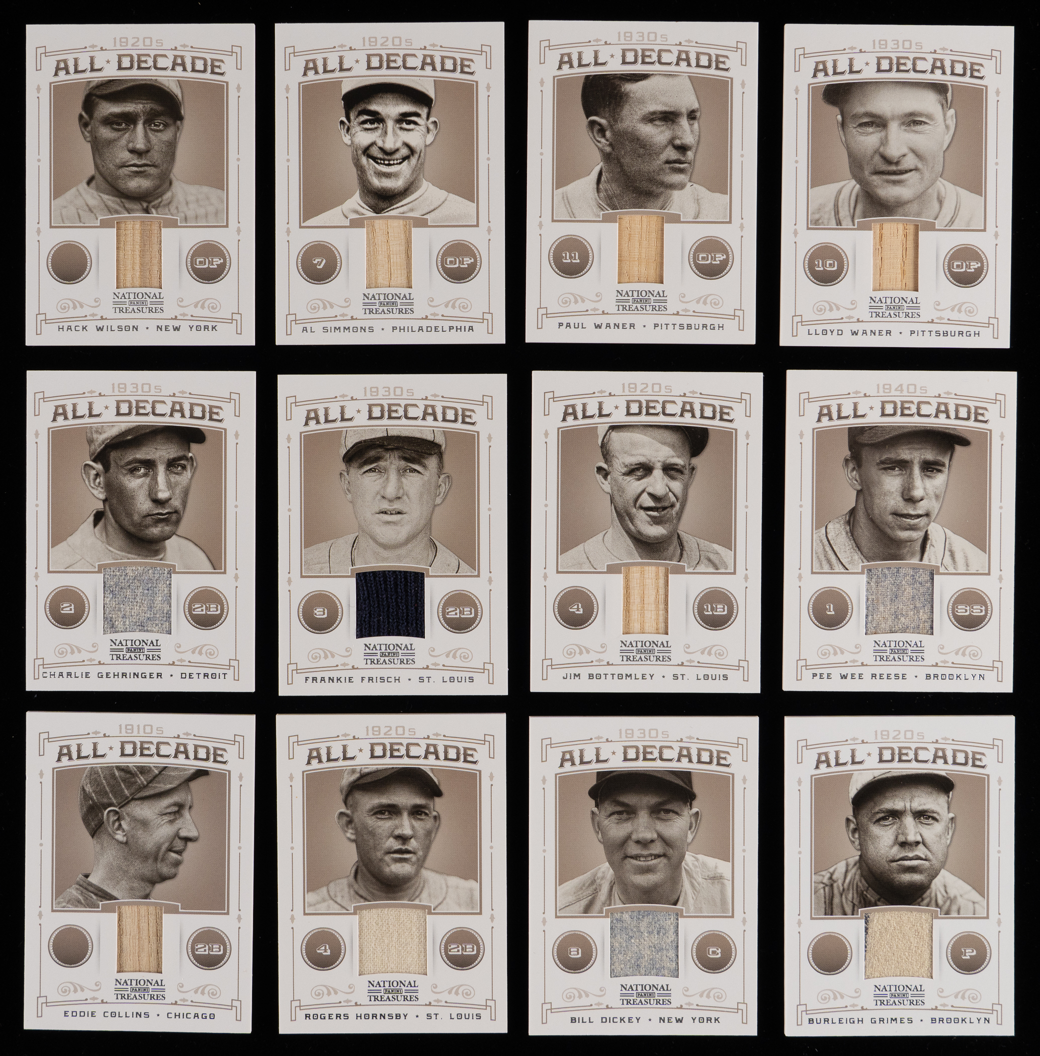 Each serially numbered #/99 or lesser. Generational talent is front-and-center with the offered 2012 Panini National Treasures All-Decade Game-Used Relics near complete set of (34/40) modern inserts. The following verified lumber slices and uniform swatches are included: #/99: (21 cards) with #1 Lajoie, #3 Cobb, #4 Daubert, #8 Bancroft, #12 Heilmann, #13 Huggins, #14 G. Kelly, #15 Kamm, #17 Terry, #18 H. Wilson, #23 Cronin, #27 P. Waner, #32 Klein, #32 Greenberg. #34 Simmons, #35 Goslin, #36 L. Waner, #37 Keeler, #38 Speaker, #39 Reese (with pinstripe), #40 J. Robinson; #/49: (3 cards) with #8 J. Jackson, #9 Bottomley, #25 DiMaggio (with pinstripe); #/30: #18 Gehrig (with pinstripe); #/25: (9 cards) with #2 Wagner, #5 E. Collins, #10 Hornsby, #11 Grimes (with pinstripe), #19 Frisch, #20 Gehringer, #26 Ott, #28 Dickey and #29 Grove.