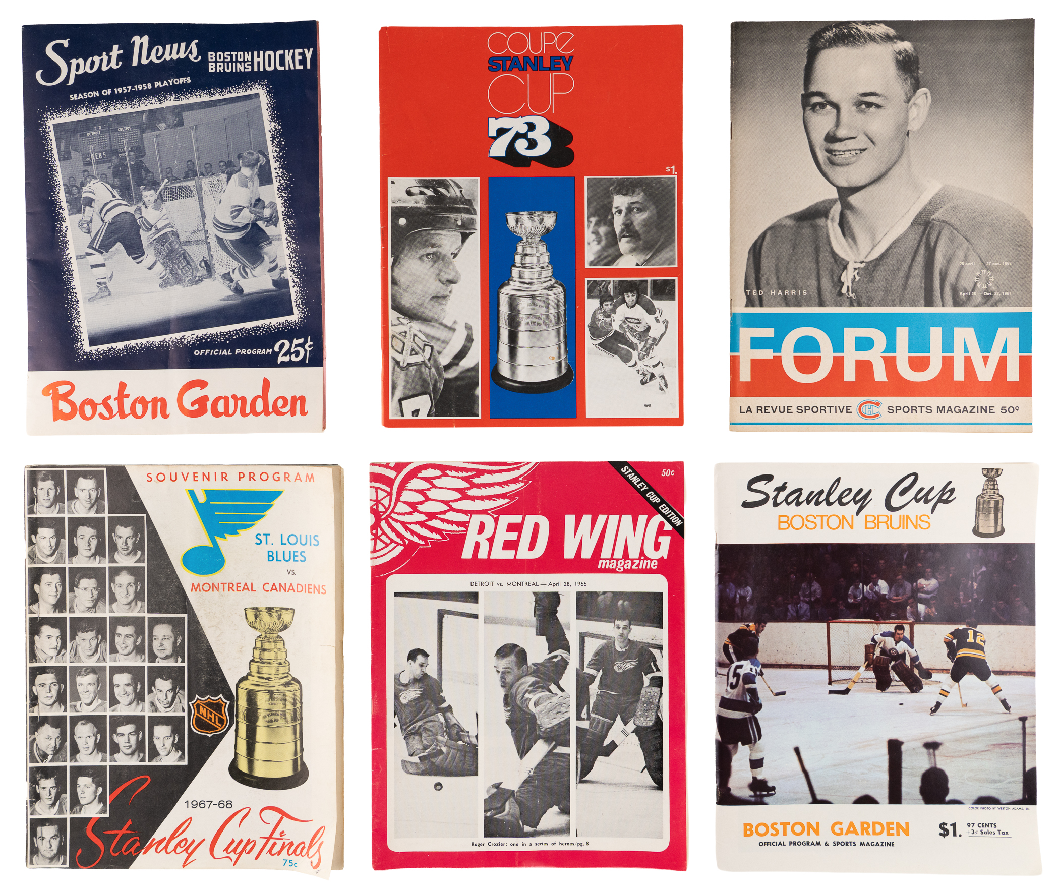 Skate away satisfied with this 1958-1973 Stanley Cup Finals and Playoffs program collection (7) in tow. The NHL's annual postseason tournament is an action-packed affair, followed by rabid fans who are eager to feast on the excitement. This vintage selection brings you face to face with the build-up to a half-dozen games played during the final round, including a couple from the "Original Six" era, along with the great Bobby Orr's first appearance among the Playoffs final four teams. Hockey programs from this period are generally tough, and finding a group this large is a quite a thrill!