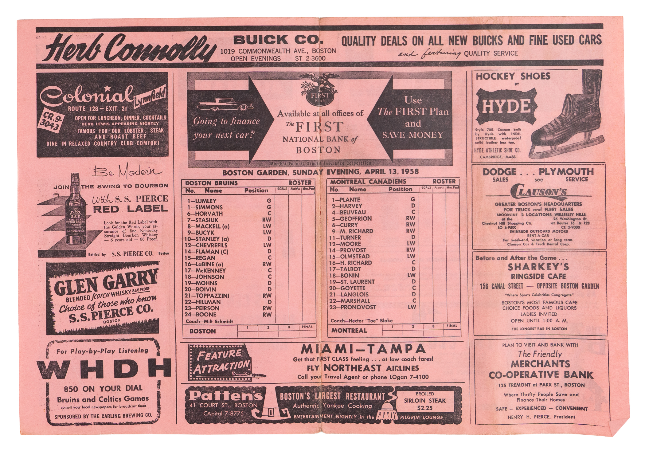 1957-1958 Stanley Cup Finals Game 3 with gameday roster insert Vg, score Montreal-3, Boston-0;