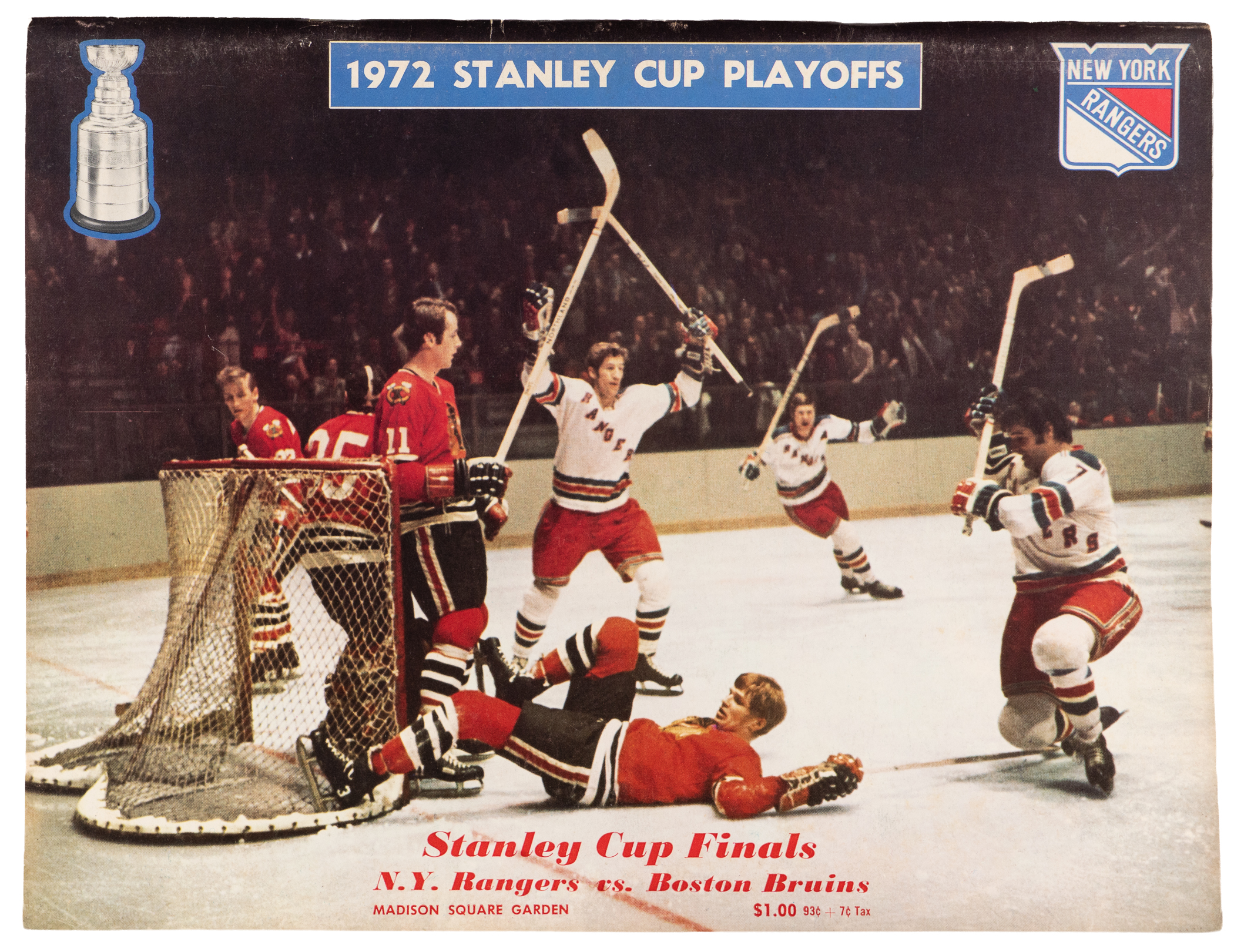 1971-1972 Stanley Cup Finals Game 3 Ex with ticket stub and newspaper clippings, score New York Rangers-3, Boston-2;
