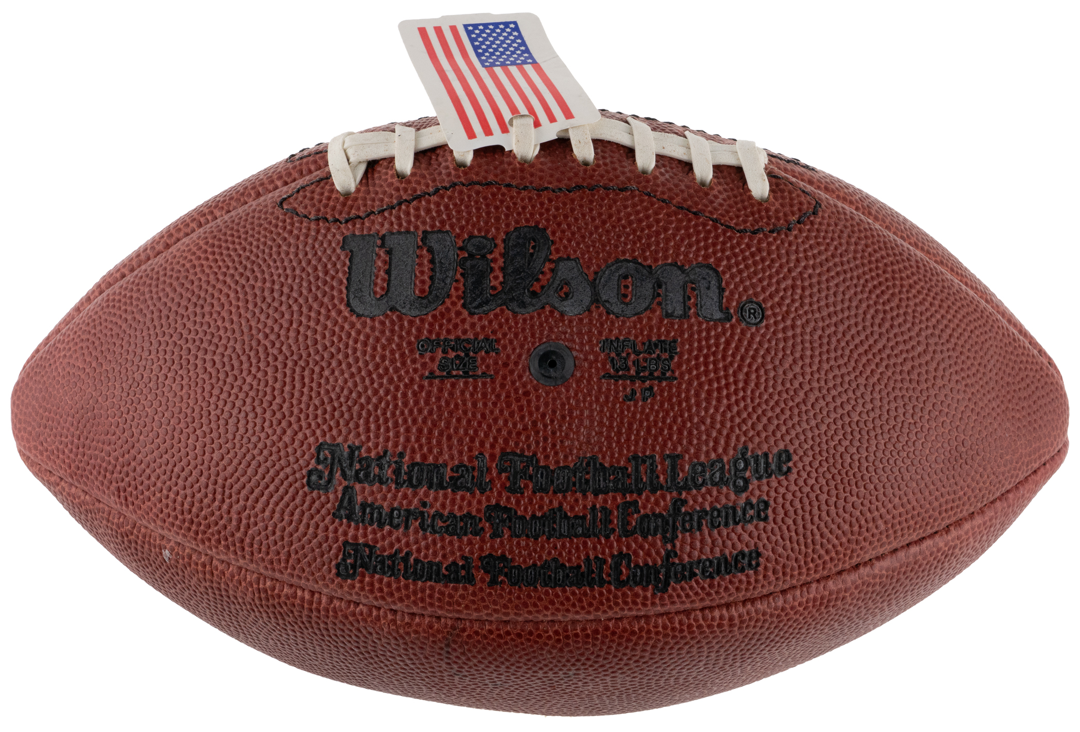 Wilson "Official" NFL Pro model football signed by legendary Hall of Famer John Madden (deceased 2021). Penned in silver paint-pen, the bold signature displays well, placed on the panel below the NFL insignia. The panel below displays a small, non-intrusive stain and the bladder does not retain a capacity PSI level of air. Nonetheless, the overall form and shape of the football remain intact. All in all, a very aesthetically pleasing example signed by Coach. Accompanied by the original Wilson box.