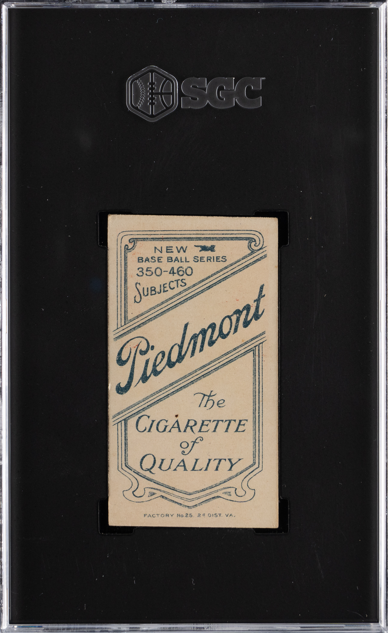 Graded VG/EX+ 4.5 by SGC. A bemused "Muggsy" is front-and-center on the offered 1909-1911 T206 White Borders John McGraw "Portrait, with Cap" pose. This colorful illustration is crease-free with bold surface colors and slightly touched corners. A slight diamond cut does not seriously impact this relic's overall presentation. Piedmont 350-460 Subjects (Factory 25) back.