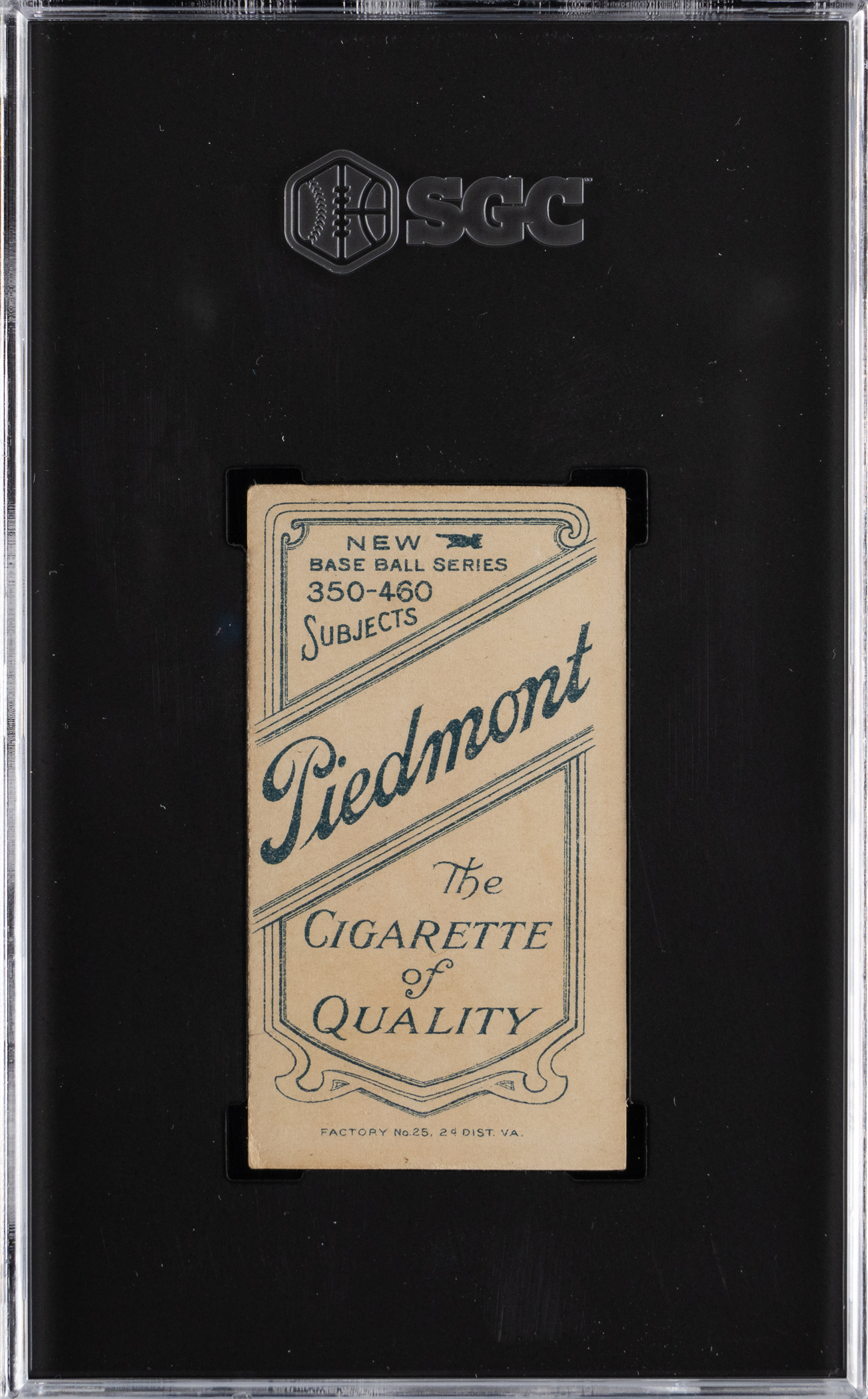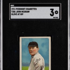 Graded VG 3 by SGC. John (Muggsy) McGraw dons a mitt on the offered 1909-1911 T206 White Borders "Glove at Hip" pose. This timeless rendering of the New York Giants Hall of Famer is flanked by a Piedmont 350-460 Subjects (Factory 25) back.