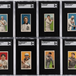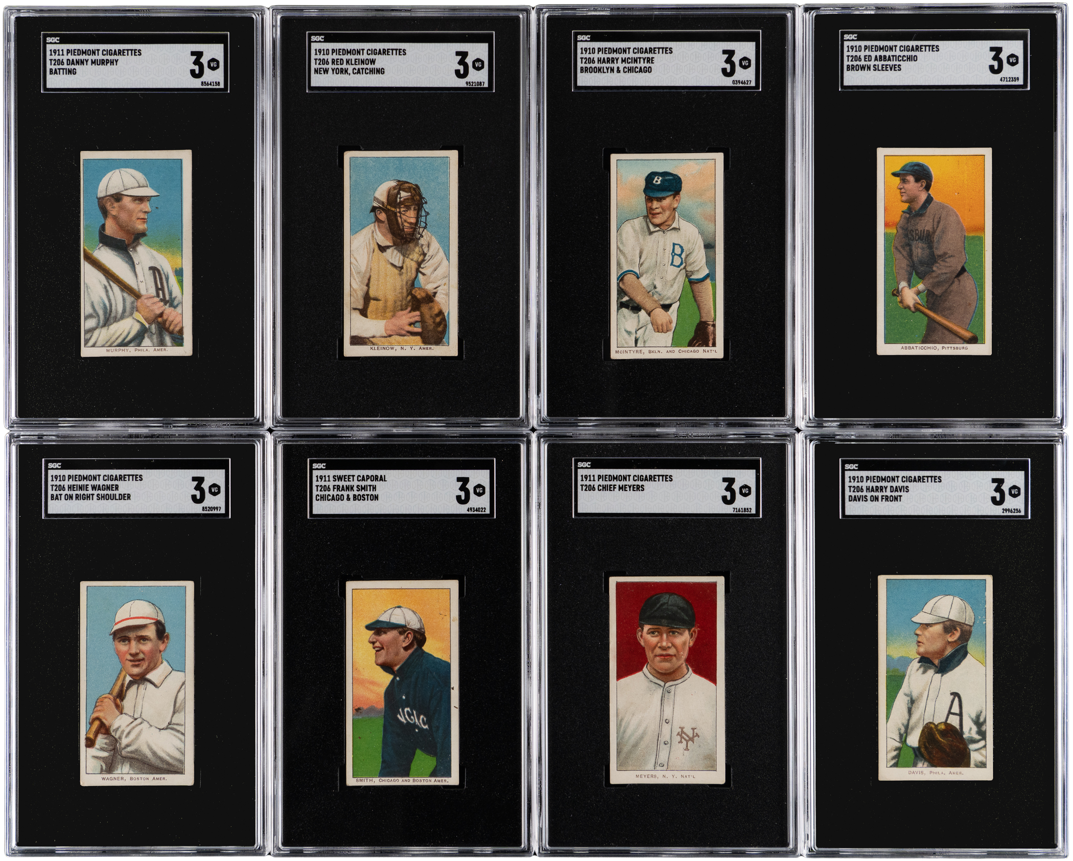Each graded VG 3 by SGC with common advertising backs. Snag these (16) 1909-1911 T206 White Border singles. This mid-grade compilation includes the following subjects: Abbaticchio (Blue Sleeves), Arellanes, Bridwell (Portrait, with Cap), H. Davis (Davis on Front), Devore, Kleinow (New York, Catching), H. McIntyre (Brooklyn & Chicago), Meyers, Murphy (Batting), Nattress, Oldring (Batting), Pelty (Vertical Photo), F. Smith (Chicago & Boston), H. Smith, He. Wagner (Bat on Right Shoulder) and Wilhelm (with Bat).