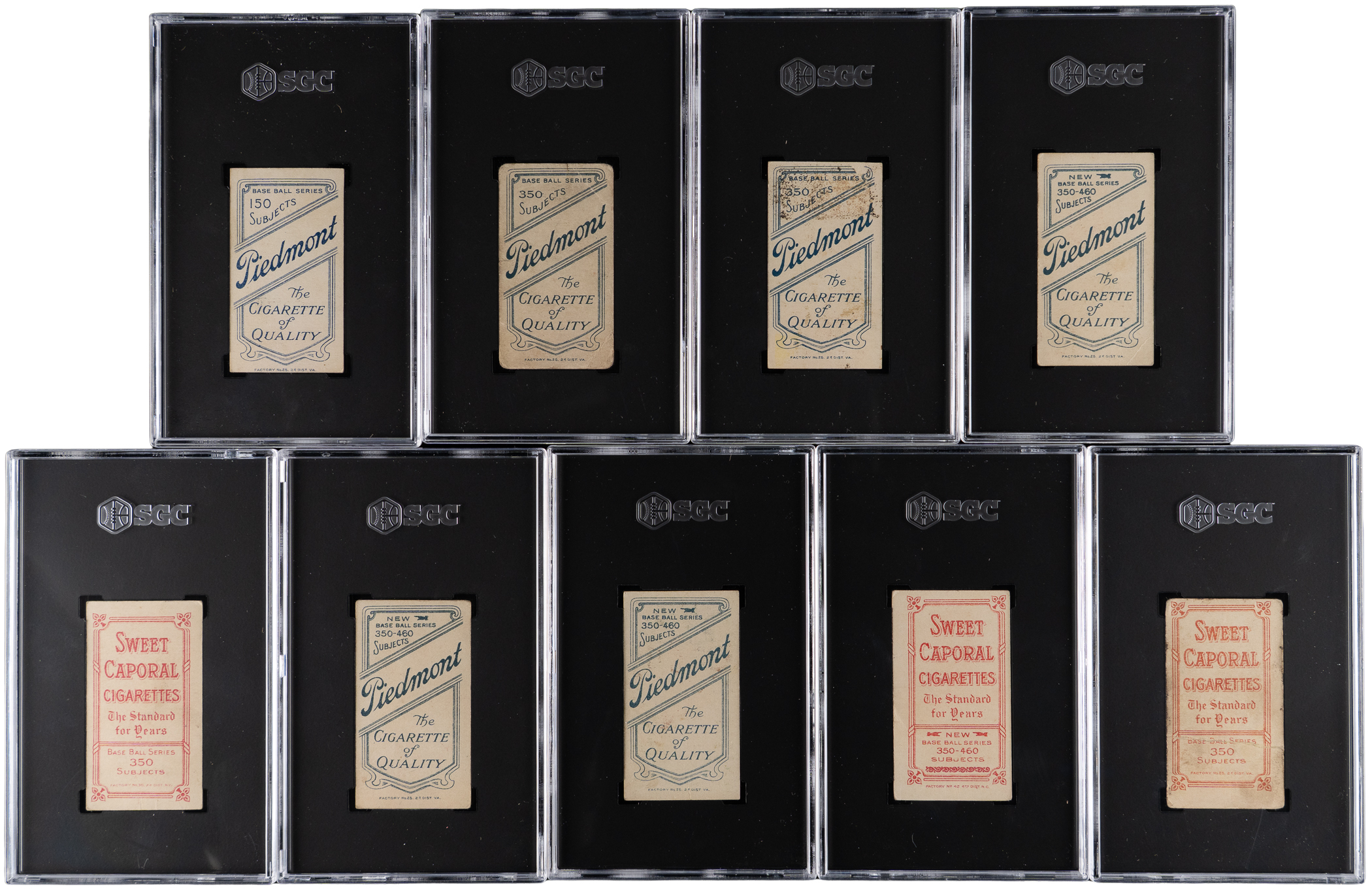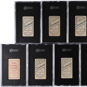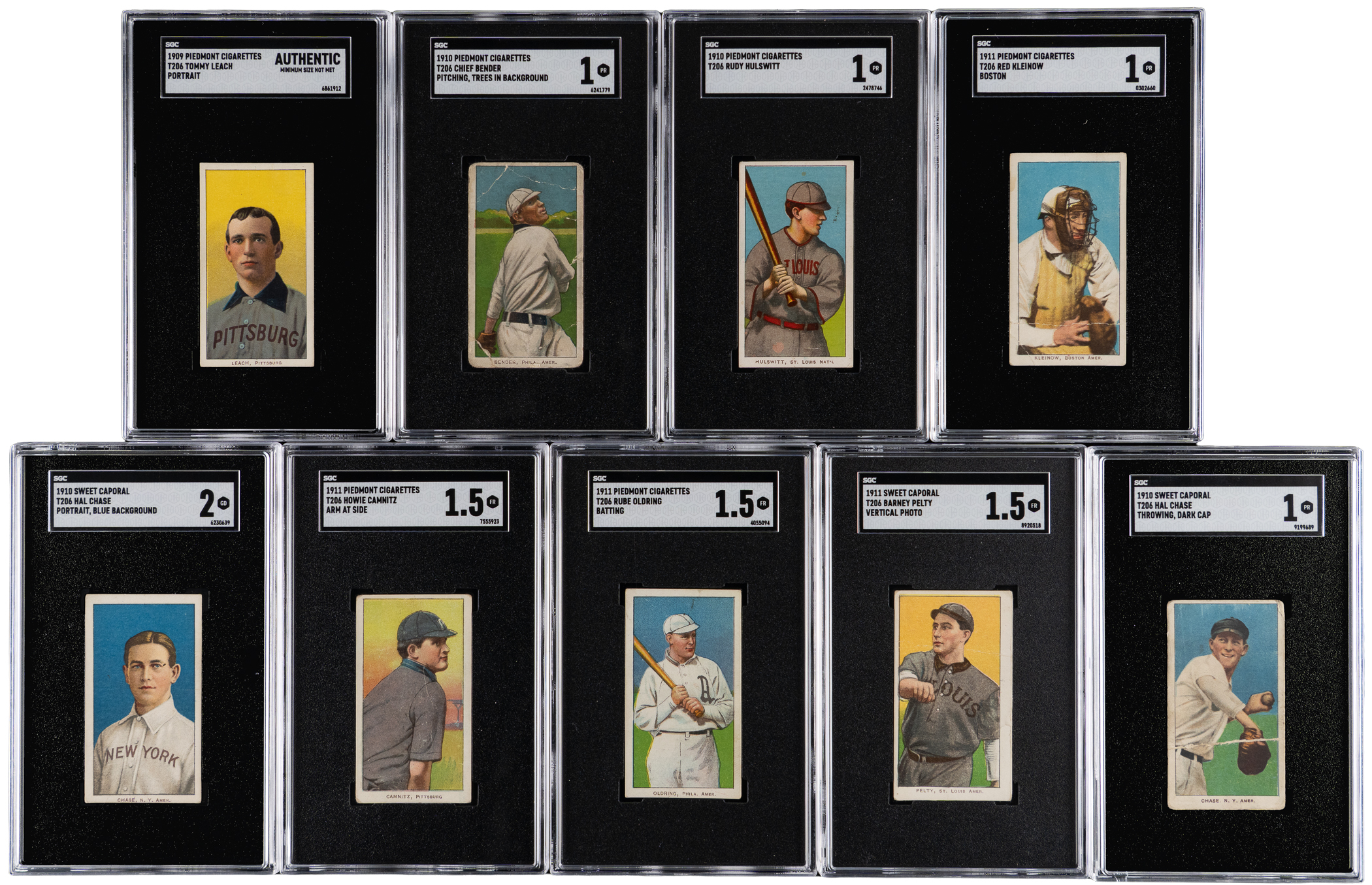 Each graded by SGC with common advertising backs. Century-old sampling of (9) 1911 T206 White Border singles with multiple Hall of Famers/stars and tougher variants. Includes: SGC GOOD 2: Chase (Blue Portrait); SGC FAIR 1.5: (3 cards) with Camnitz (Arm at Side), Oldring (Batting), Pelty (Vertical Photo); SGC POOR 1: (4 cards) with Bender (Pitching, Trees in Background), Chase (Throwing, Dark Cap), Hulswitt, Kleinow (Boston) and SGC Authentic: Leach (Minimum Size Not Met).