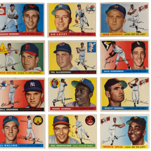 Go “all in” for the offered 1955 Topps partial set of (145/206) cards with several stars and a dozen tougher high numbers (average GD to VG). This horizontal assembly generally presents in the (GD to VG) range with some better or lesser. Highlights include: #1 Rhodes (GD, stain), #4 Kaline (GD), #5 Gilliam (PR, paper loss), #19 Herman (GD), #22 Skowron (FR), #24 Newhouser (GD), #47 Aaron (PR, paper loss), #100 Irvin (GD, reverse paper pulling), #120 Kluszewski (VG), #125 Boyer RC (GD) and #156 Black (PR, paper loss).