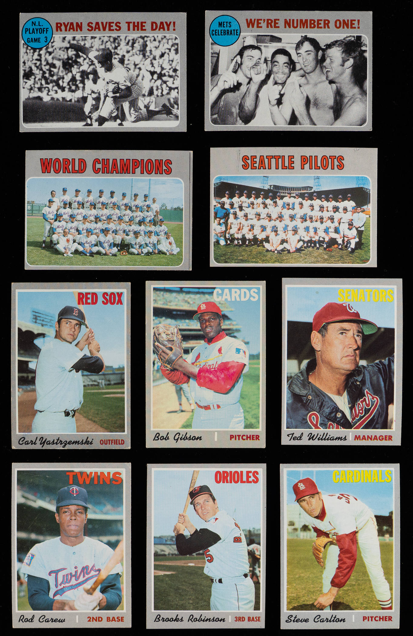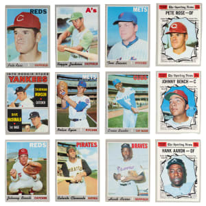 Score with the offered 1970 Topps near complete set of (680/720) cards with five graded, most keys and (71) tougher high numbers (average VG-EX). These silver borders have an approximate condition breakdown of 20% (EX-MT or better), 30% (EX), 25% (VG-EX) and 25% (VG or lesser). Highlights include: #1 Mets Team (VG), #10 Yastrzemski (GD), #140 R. Jackson (EX), #189 Munson RC (GD), #197 Ryan Playoffs (VG), #198 Mets Celebrate/Ryan (VG-EX), #211 T. Williams (EX), #220 Carlton (VG-EX), #230 B. Robinson (EX-MT), #290 Carew (VG), #300 Seaver (GD), #350 Clemente (EX-MT), #458 Rose AS (VG), #462 Aaron AS (VG-EX), #464 Bench AS (EX), #500 Aaron (GD), #530 Gibson (VG-EX), #580 Rose (EX), #630 Banks (EX-MT), #660 Bench (VG-EX), #700 #712 Ryan (VG-EX) and #713 Pilots Team (VG-EX); PSA NM 7 Commons: (2 cards) with #369, 706; GMA EX-NM+ 6.5: #595; PSA EX-MT 6: #715 and PSA EX 5: #683.