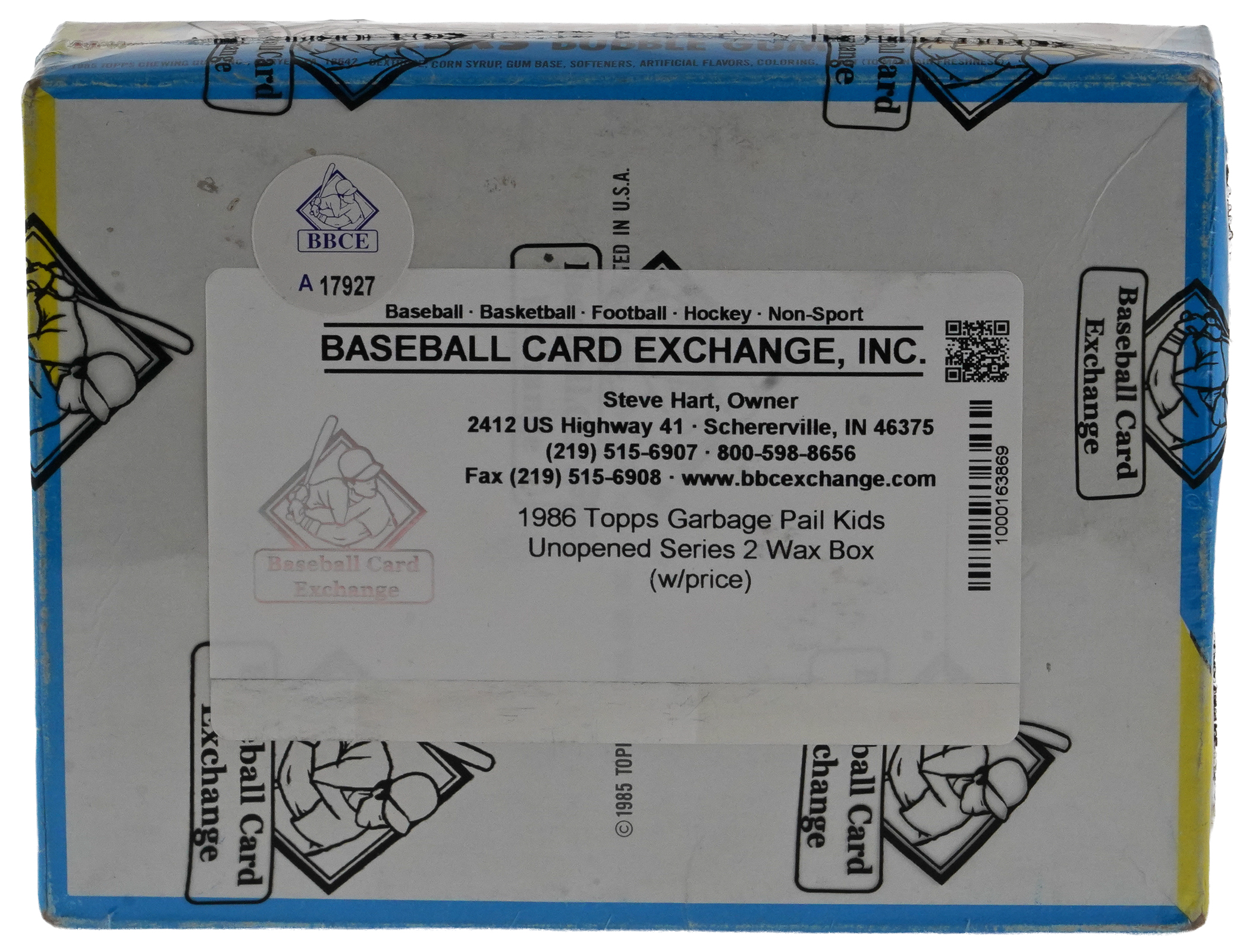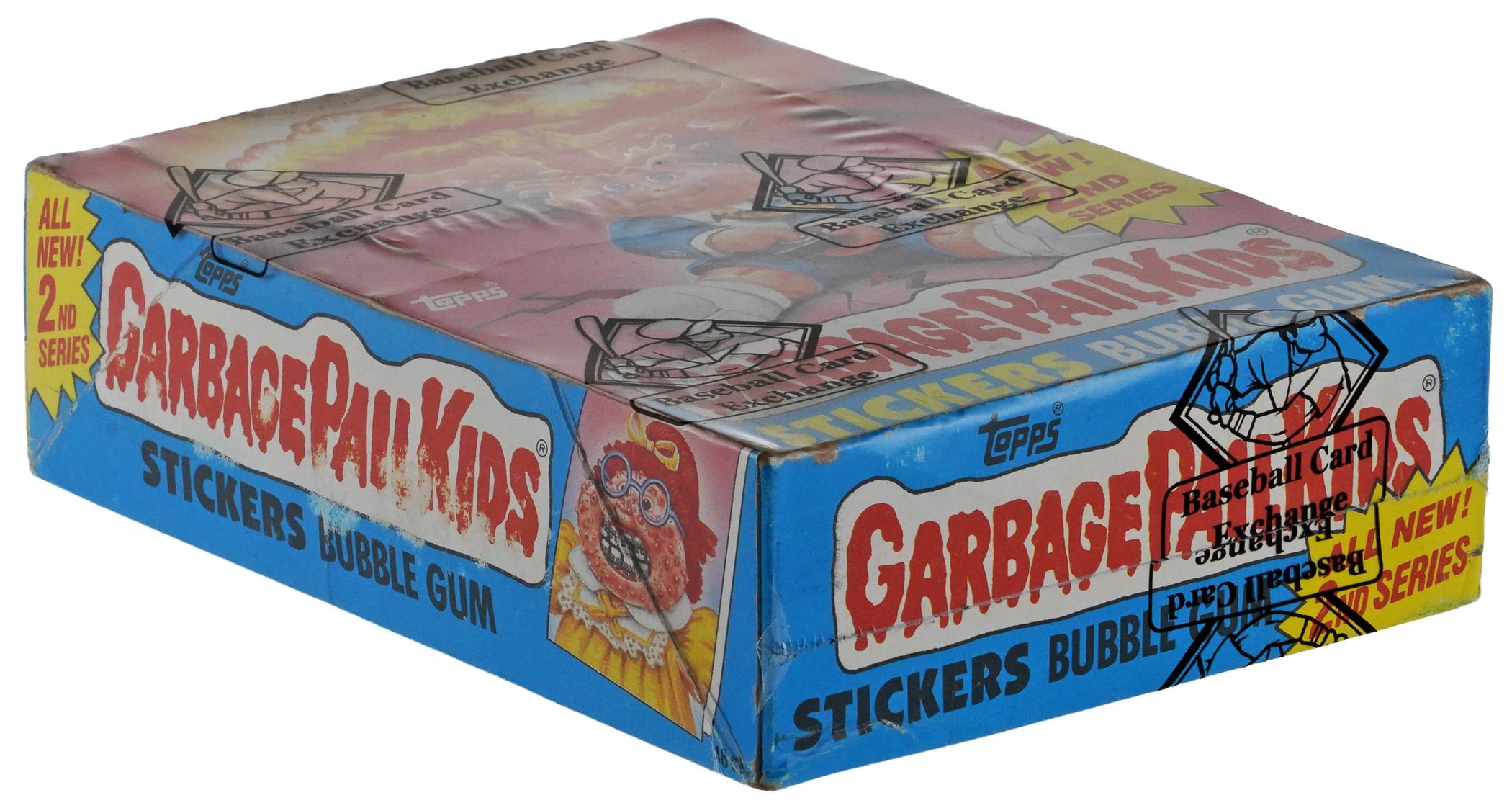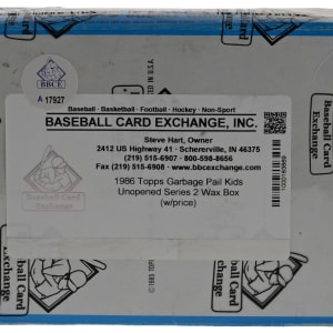 The grotesque Garbage Pail Kids ooze with the offered 1985 Topps Series 2 unopened wax box. This unsearched container will deliver (48) 5-sticker packs which could yield an 84-card series set or key variations. The entire box comes shrink-wrapped by Baseball Card Exchange (owned by Steve Hart, the foremost expert on unopened material). Label identifies the set is from 1986, when in actuality the set is from 1985.