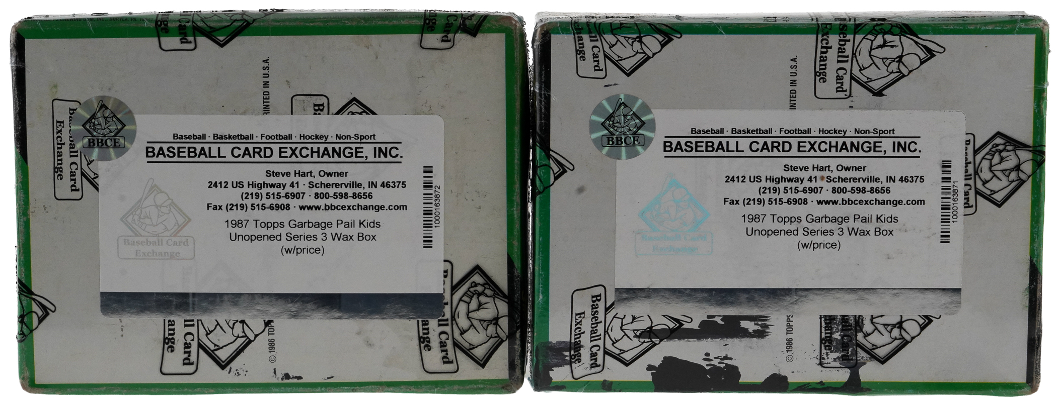 Rise to the top of the heap with the offered 1986 Topps Garbage Pail Kids Series 3 unopened wax box pair. These rude and crude "X-out" containers will yield (48) 5-sticker packs per. Find multiple series sets with these rug rats that contain price notations. Each box comes shrink-wrapped by Baseball Card Exchange (owned by Steve Hart, the foremost expert on unopened material). Label identifies the set is from 1987, when in actuality the set is from 1986.