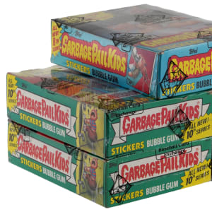 The snot-nosed miscreants of the Garbage Pail Kids franchise ooze their way into your collections with these five 1986 and 1987 Topps Series 3-10 unopened wax boxes. Each unsearched "X-out" container (unless noted) will deliver (48) 5-sticker packs plus a stick of bubble gum per. Multiple complete series sets are probable! Includes: Series 3 (non "X-out", with price), Series 8 (without price), Series 9 (with price) and (2) Series 10 (both without prices). Each box comes shrink-wrapped by Baseball Card Exchange (owned by Steve Hart, the foremost expert on unopened material).
