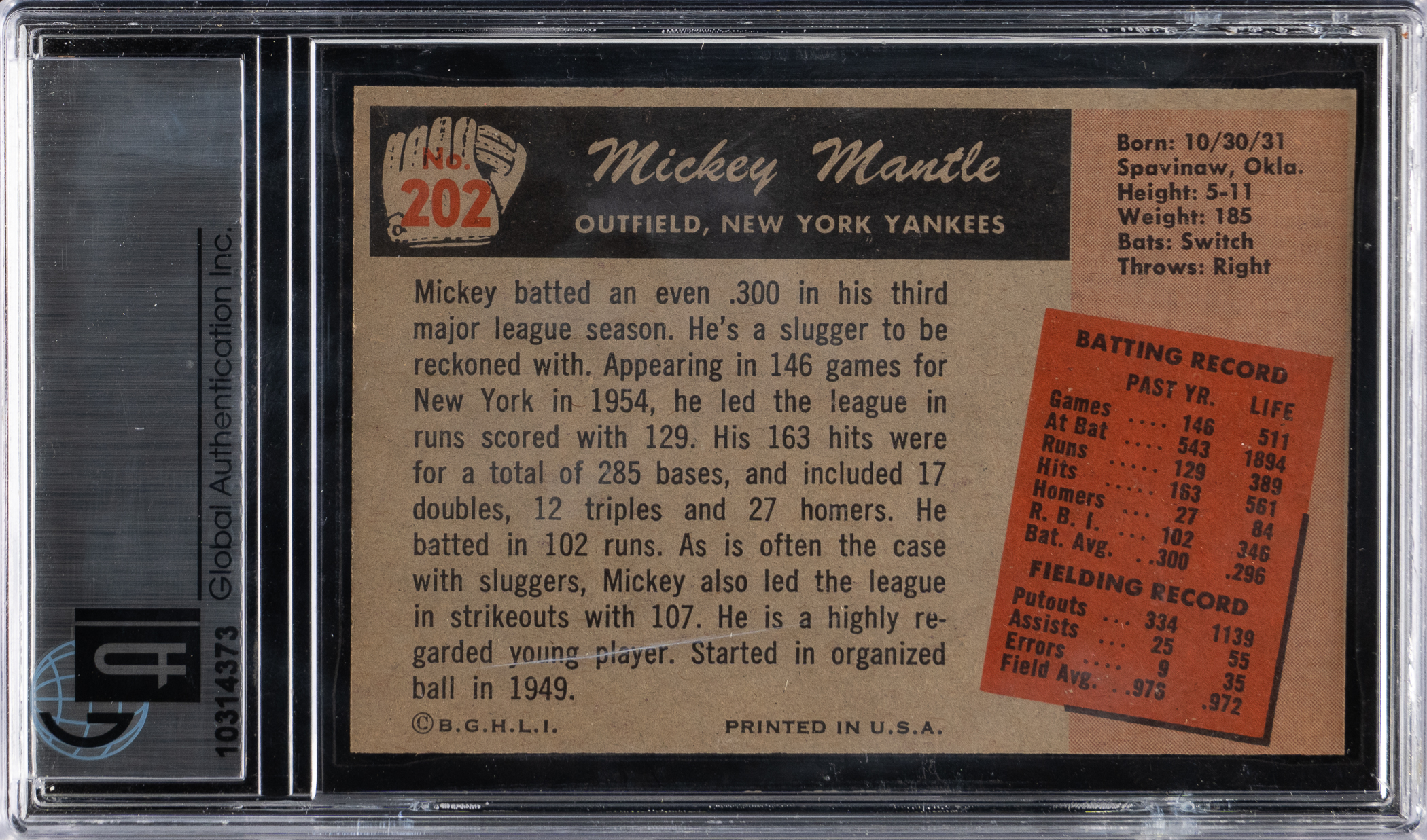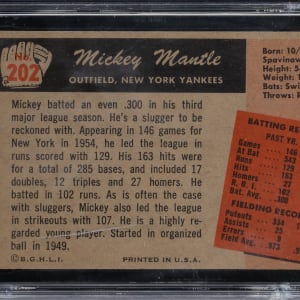 Graded MINT 9 by Global Authentication. A youthful Mickey Mantle aims for the fences on the offered 1955 Bowman #202 centerpiece. This wood-grained gem of the New York Yankees Hall of Famer has survived the decades in impressive condition! It should be noted that an interior crack is found on the back of the holder.