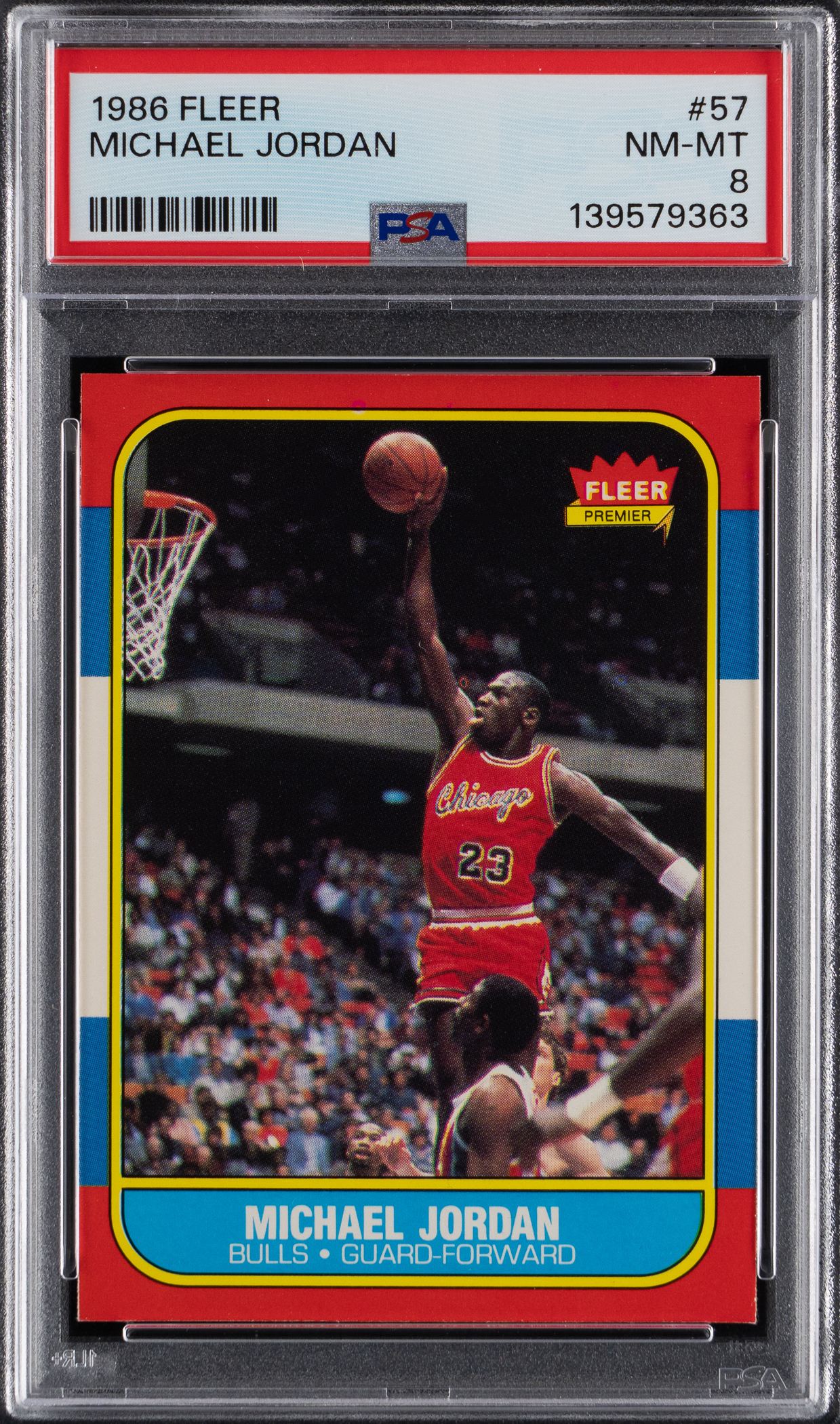 Graded NM-MT 8 by PSA. This world class 1986-1987 Fleer Basketball #57 Michael Jordan rookie card appears as when it was initially pulled from a wax pack decades ago. This cardboard classic is accurately centered with four sharp corners, factory crisp edges and picture perfect registration. The reverse, which details Jordan's early Chicago Bulls statistics, is crystal clear.