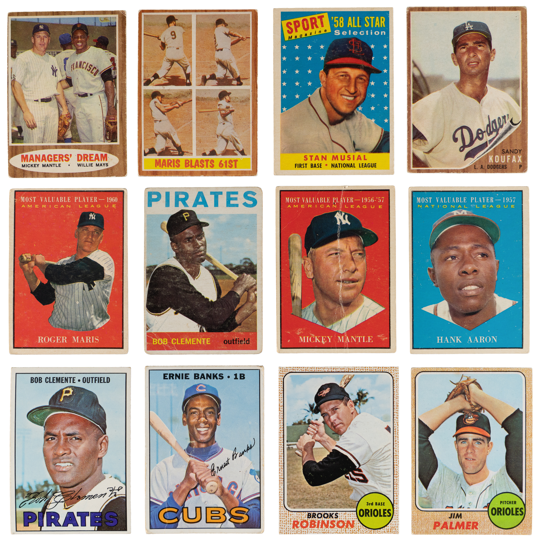 1967 Topps: (69 cards, average VG) with #215 Banks (FR), #400 Clemente (VG-EX), #445 Sutton (VG), #475 Palmer (VG-EX), #510 Mazeroski (EX);