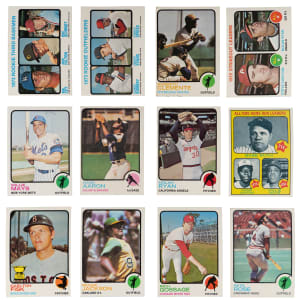 Showcased is a 1973 Topps near complete set of (640/660) cards with most checklisted keys. This final multi-series edition of the flagship has an overall approximate condition breakdown of 30% (EX-MT or better), 45% (EX) and 25% (VG-EX or lesser) with moderate instances of centering/size variances inherent with the issue. Highlights include: #1 Ruth/Aaron/Mays (EX), #50 Clemente (FR), #67 Carlton/Ryan LL (EX), #100 Aaron (VG-EX), #130 Rose (VG), #142 Munson (VG-EX), #174 Gossage RC (EX, oversized), #190 Gibson (VG), #193 Fisk (VG-EX), #220 Ryan (VG-EX), #245 Yastrzemski (EX), #255 R. Jackson (EX), #305 Mays (EX), #350 Seaver (EX-MT), #380 Bench (EX), #472 Gehrig LDR (EX), #473 Aaron LDR (VG-EX), #474 Ruth LDR (EX), #545 Cepeda (EX-MT), #613 Boone RC (EX), #614 Bumbry/Evans RC (EX) and #615 Schmidt RC (FR).