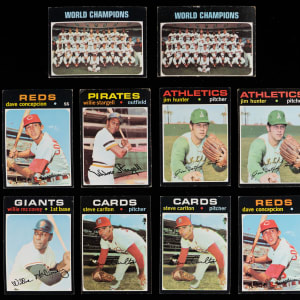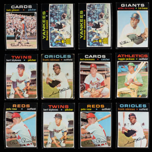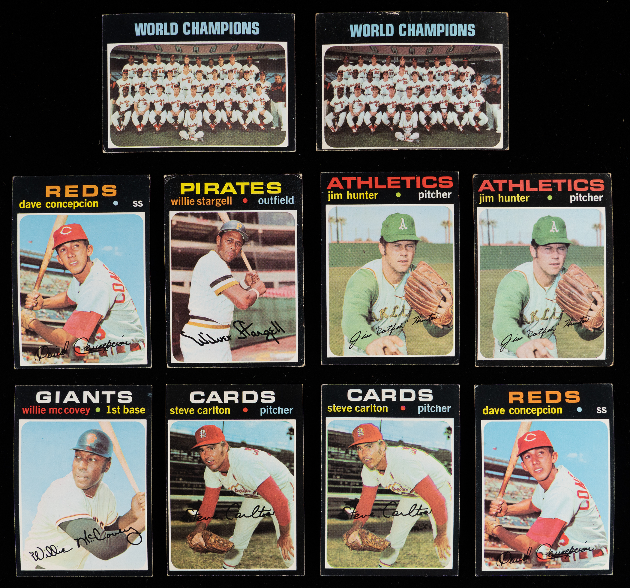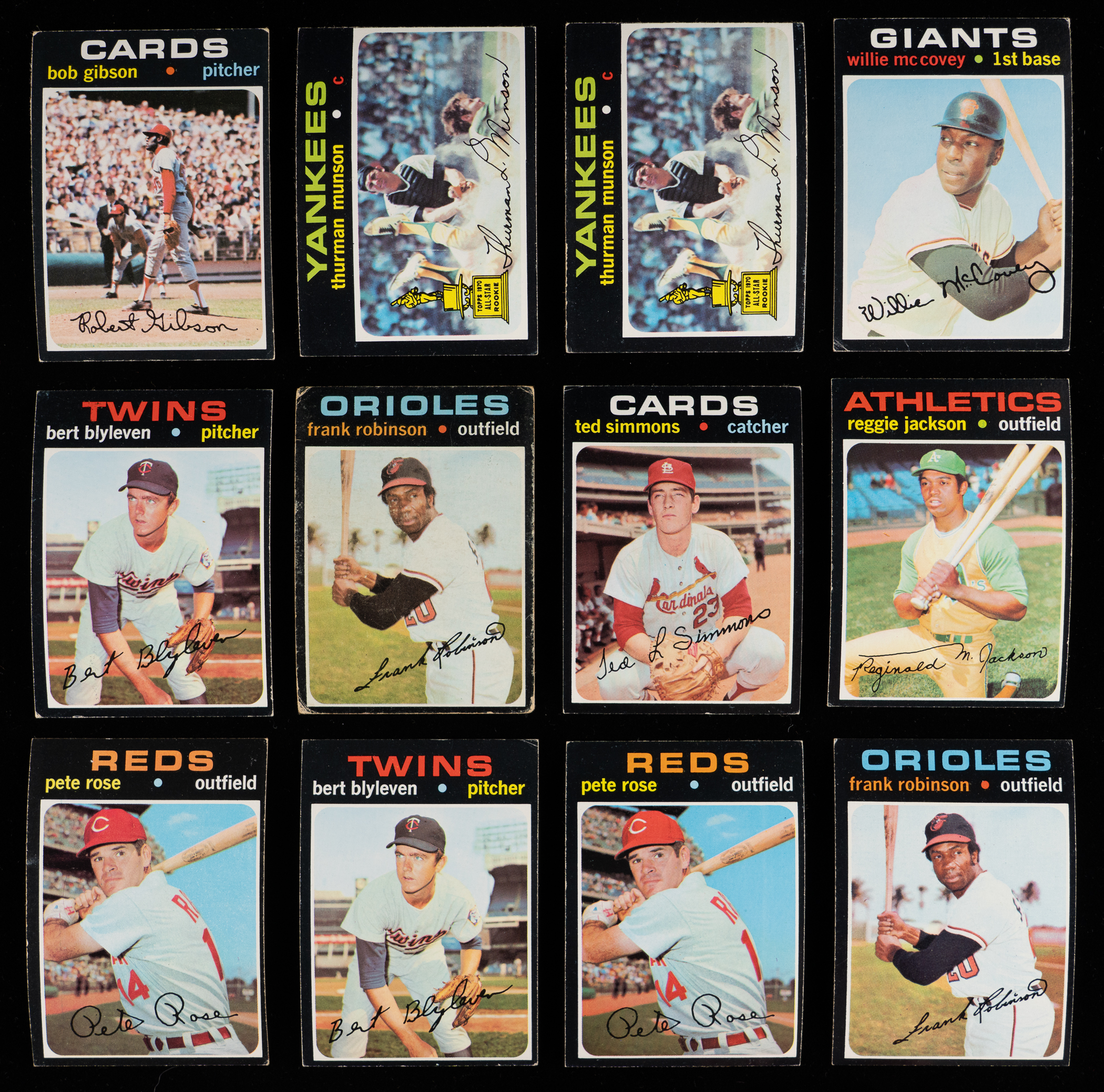 Set builders will favor the offered 1971 Topps collection of (1,050) cards featuring several Hall of Famers and stars along with (75+) high numbers. Multiple partial/starter sets are assured in this mid-grade assortment that generally presents in the (VG to EX) range with some better or lesser. Highlights include: (2) #1 Orioles Team (both GD), (2) #5 Munson (both VG), (2) #14 Concepcion RC (EX, VG-EX), #20 R. Jackson (EX), (2) #26 Blyleven RC (VG-EX, VG), (2) #45 Hunter (VG-EX, VG), (2) #50 McCovey (both GD), (2) #55 Carlton (VG-EX, VG), (2) #100 Rose (EX, VG-EX), (2) #117 Simmons RC (one VG-EX, one PR, reverse paper loss), #230 Stargell (GD), #450 Gibson (VG) and (2) #640 F. Robinson (EX, GD).