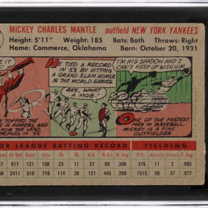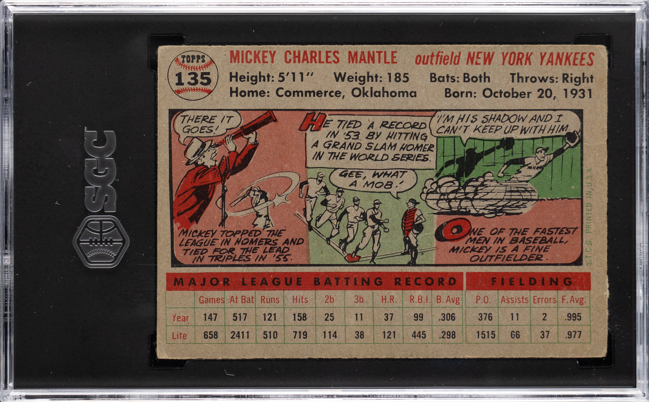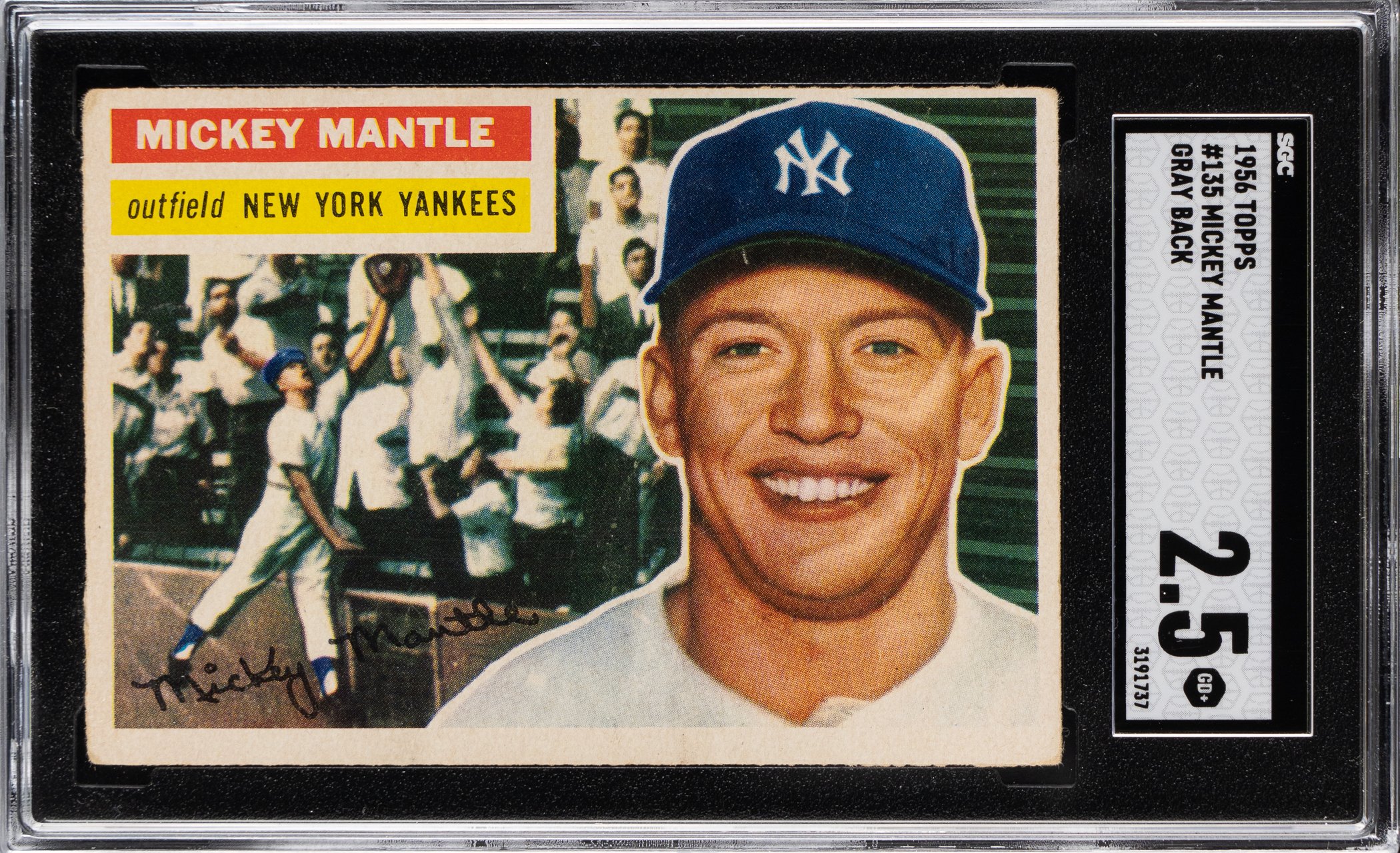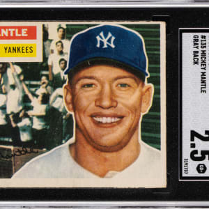Graded GOOD+ 2.5 by SGC. Classic 1956 Topps #135 Mickey Mantle example from the switch-hitter's Triple Crown campaign. This eye-catching heirloom of the New York Yankees Hall of Fame sensation displays only modest perimeter wear and presents at the tip-top of its overall evaluation. The gray back is wax stain-free.