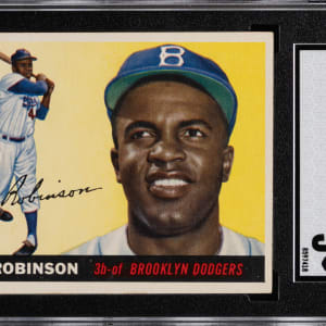 Graded EX 5 by SGC. From the season in which "Dem Bums" finally broke through to October glory arrives the offered 1955 Topps #50 Jackie Robinson. The blazing dual action/portrait pose of the Brooklyn Dodgers Hall of Famer is nicely centered with only slightly touched corners, creamy white edges and dazzling surface colors. The reverse touts #42 as "high on the list of all-time Dodger 'greats'" and is wax stain-free. Full diamond version.