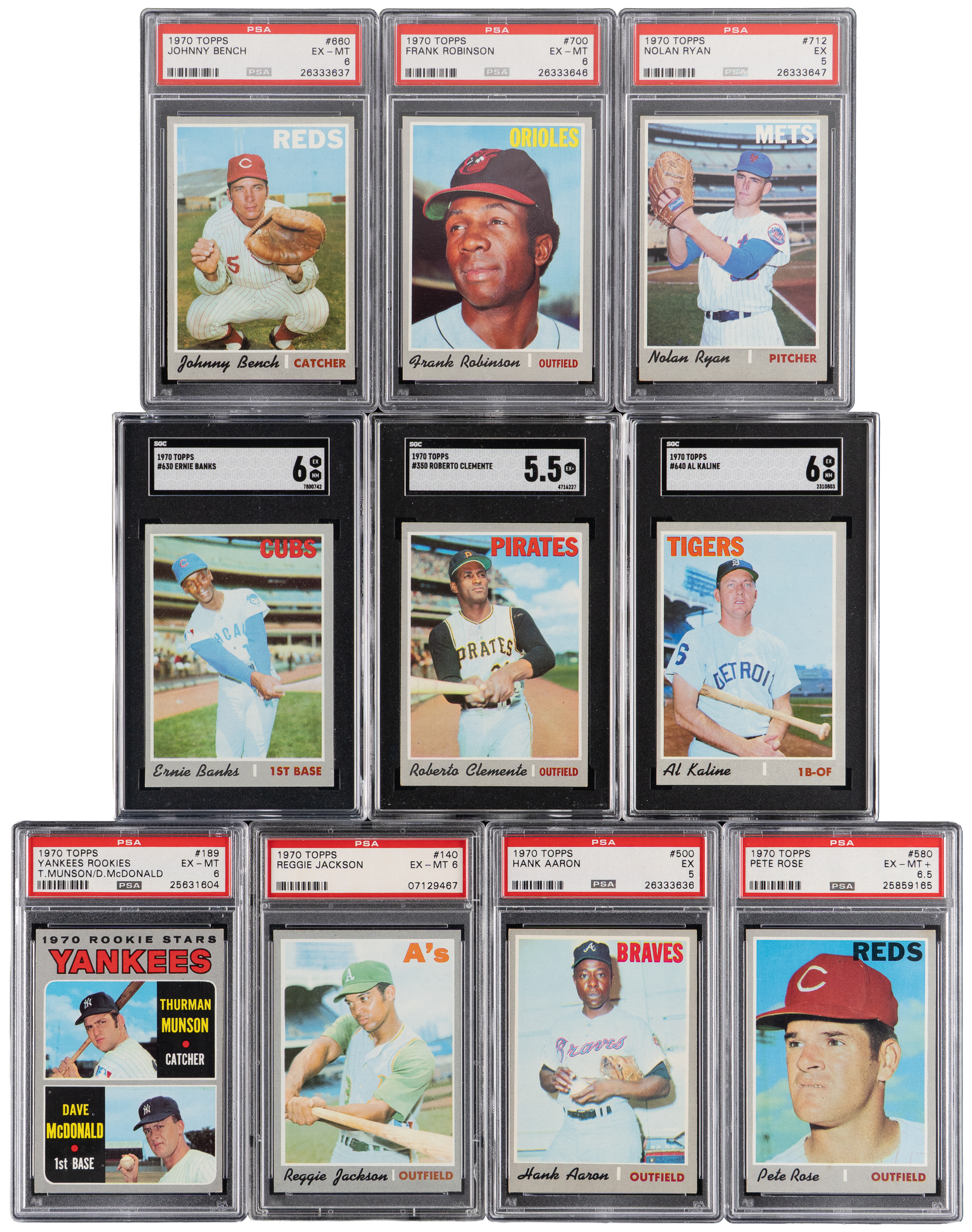 Spotlighted is a 1970 Topps complete set of (720) cards with (10) graded keys. These silver borders have an approximate condition breakdown of 25% (EX-MT or better), 30% (EX), 25% (VG-EX) and 20% (VG or lesser) with the challenging high series generally presenting on level with the more available numbers. Highlights include: #1 Mets Team (VG-EX), #10 Yastrzemski (VG-EX), #140 R. Jackson (PSA EX-MT 6), #189 Munson RC (PSA EX-MT 6), #197 Ryan Playoffs (VG-EX), #198 Mets Celebrate/Ryan (GD), #211 T. Williams (VG-EX), #220 Carlton (EX-MT), #230 B. Robinson (EX), #290 Carew (VG-EX), #300 Seaver (EX), #350 Clemente (SGC EX+ 5.5), #458 Rose AS (EX-MT), #462 Aaron AS (VG-EX), #464 Bench AS (VG-EX), #500 Aaron (PSA EX 5), #530 Gibson (EX-MT), #580 Rose (PSA EX-MT+ 6.5), #600 Mays (VG-EX), #630 Banks (SGC EX/NM 6), #640 Kaline (SGC EX/NM 6), #660 Bench (PSA EX-MT 6), #700 F. Robinson (PSA EX-MT 6), #712 Ryan (PSA EX 5) and #713 Pilots Team (EX).