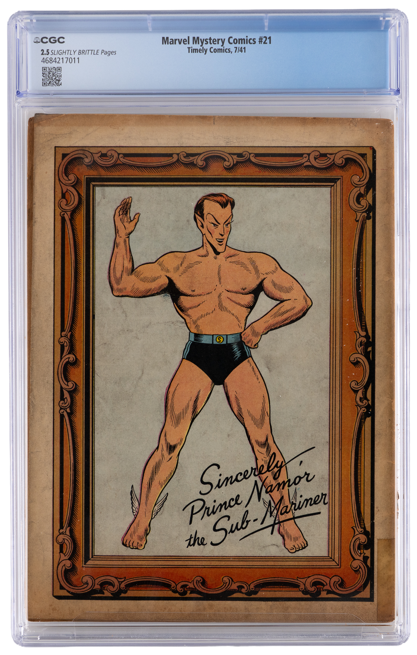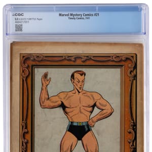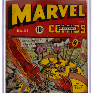A winning lineup of creators is credited for this 7/41 Timely Comics Marvel Mystery Comics #21 issue. This is the title that got the ball rolling for Timely in 1939, and celebrated artists and writers Stan Lee, Jack Kirby, Joe Simon, Bill Everett, Carl Burgos, and Alex Schomburg are counted among the movers and shakers that turned Timely's success into a Golden Age avalanche of classic hit titles and superheroes. All of the above are named in the credits appearing on CGC's grading label, which announces a rating of 2.5, Slightly Brittle Pages for this thrilling wartime issue. Also noted are the first appearance of the Patriot, and a Sub-Mariner pin-up on the back cover. Label notes are "Carl Burgos, Bill Everett, Jack Kirby, Joe Simon & Paul Gustavson story & art Ben Thompson art, Alex Schomburg cover. 1st appearance of the Patriot. Back cover Sub-Mariner pin-up. Text story by Stan Lee."