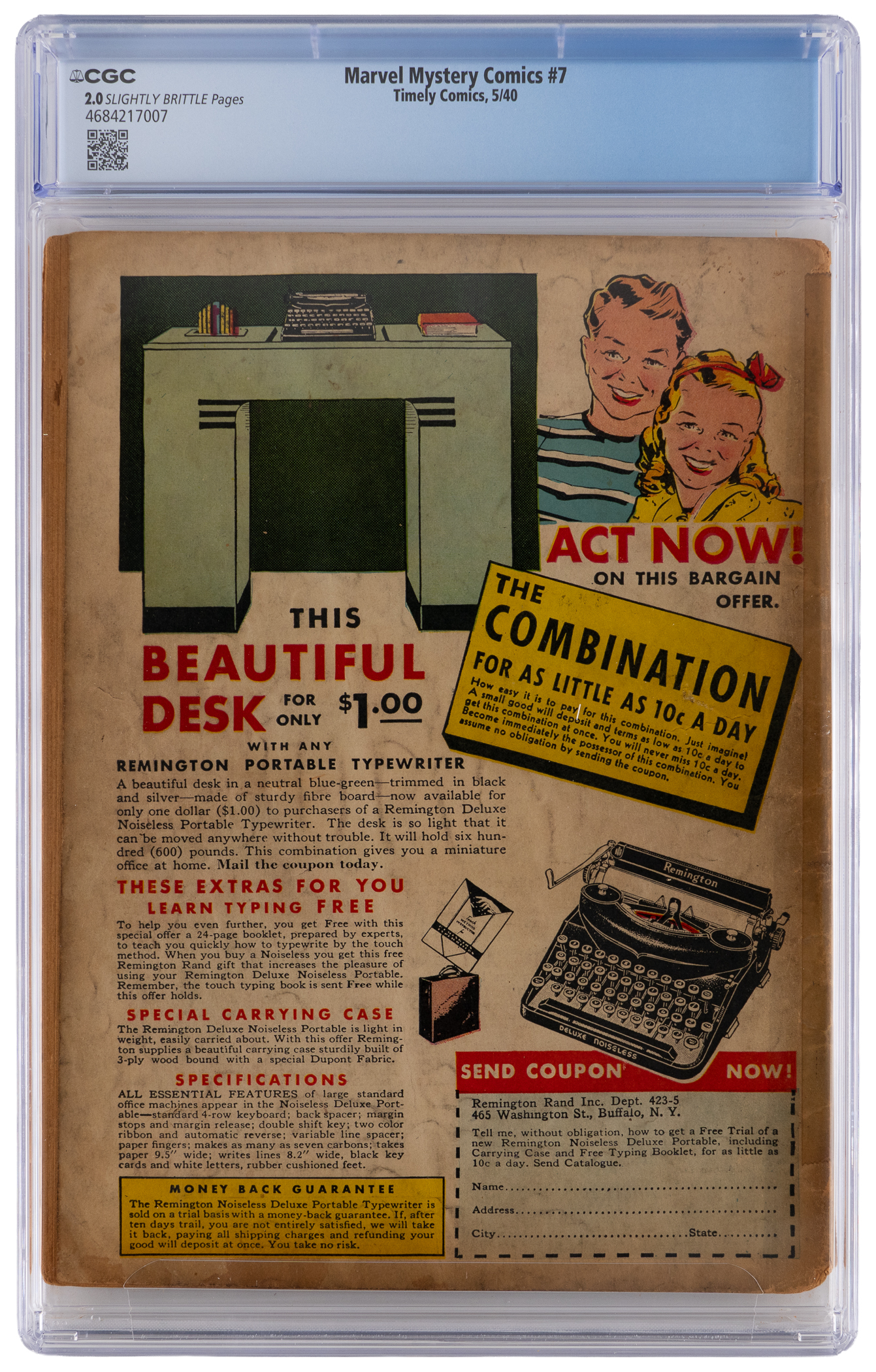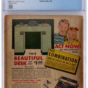 An early superhero thriller is spotlighted, with the presentation of this 5/40 Timely Comics Marvel Mystery Comics #7 issue. Timely got into the superhero game in 1939, when it launched its first comic book under the name "Marvel Comics". Beginning with the second issue, this title was rechristened "Marvel Mystery Comics". This early Timely effort stands as a great historic treasure, with the Human Torch and the Sub-Mariner playing the starring roles. This exciting issue sees the Sub-Mariner attack New York City, while the Human Torch joins the NYPD, setting the table for their impending battle over this title's next three issues. CGC has rated this Golden Age treasure 2.0, Slightly Brittle Pages. Label notes are "Carl Burgos & Bill Everett story & art, Paul Gustavson, Irwin Hasen & Steve Dahlman art, Alex Schomburg cover. Frank Thomas text illustration. Bondage cover.".