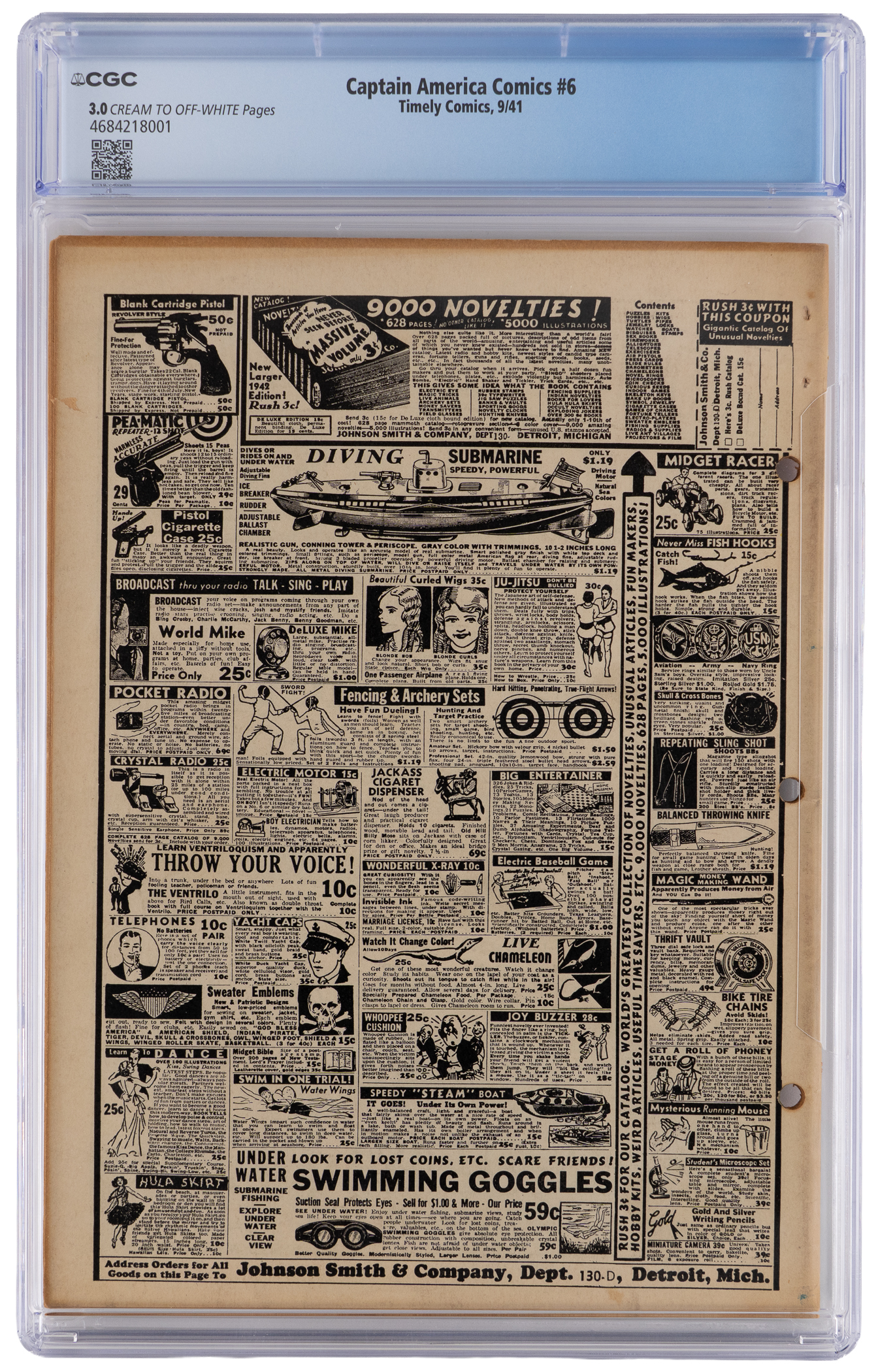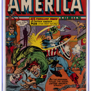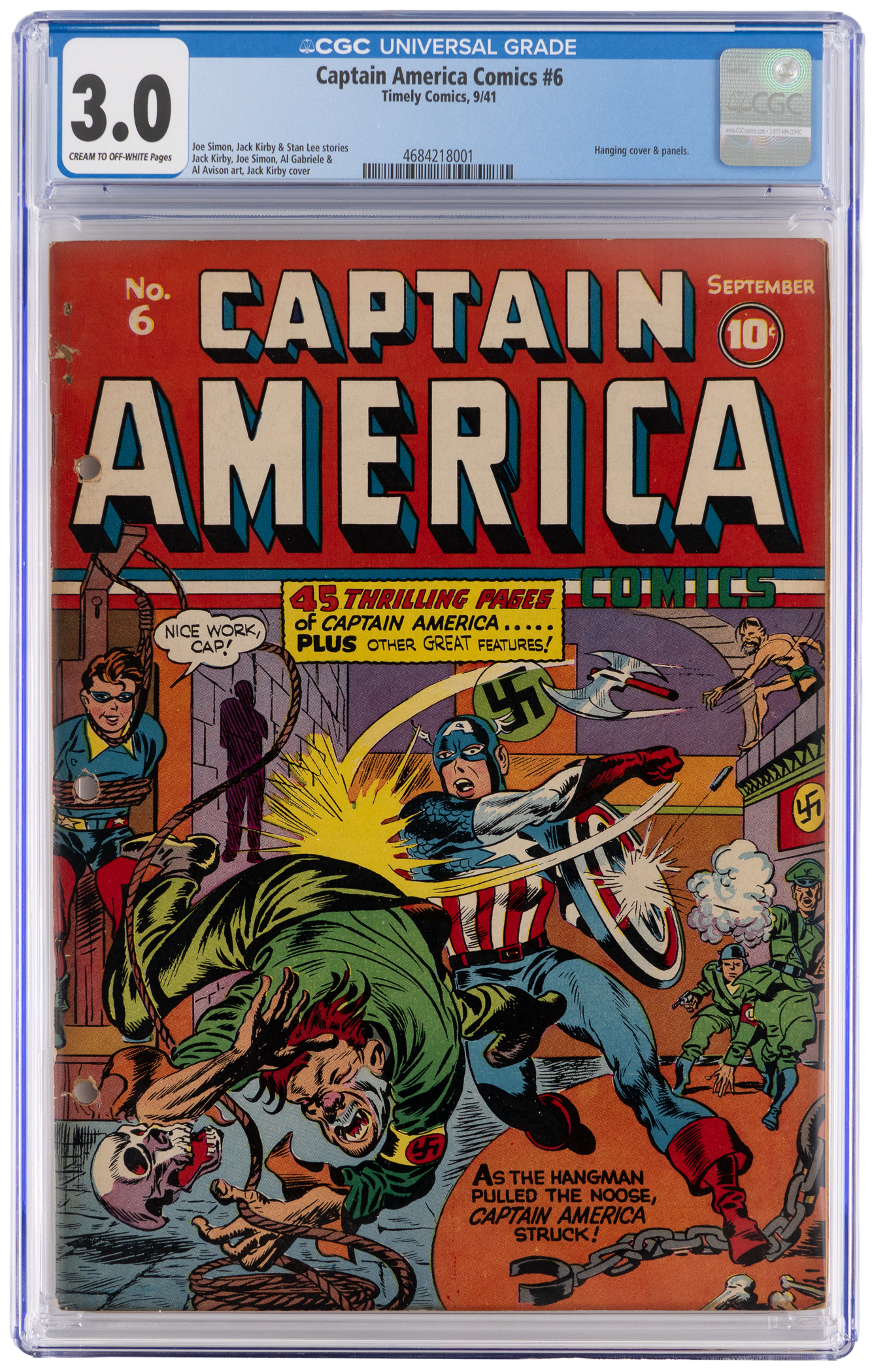 Legends are credited with the creation of this 9/41 Timely Comics Captain America Comics #6 issue. Let's start with Jack Kirby's compelling cover, which sees Caps' trusty sidekick Bucky trussed up on the gallows, facing an evil fate at the hands of a nefarious hangman. The cover colors are astonishingly vibrant, and with swastikas decorating the setting, the identity of the bad guys as Nazis is confirmed. Then there's credits for stories and art to Kirby, Joe Simon, Stan Lee, Al Gabriele, and Al Avison, a who's who lineup in the realm of comic creators. And oh yeah, this is issue #6! Three hole-punches along the spine limit the grade of this early Golden Age treasure to 3.0, with a Cream to Off-White Pages designation. Otherwise, this high-profile comic presents handsomely. Label notes are "Joe Simon, Jack Kirby & Stan Lee stories, Jack Kirby, Joe Simon, Al Gabriele & Al Avison art, Jack Kirby cover. Hanging cover & panels.".