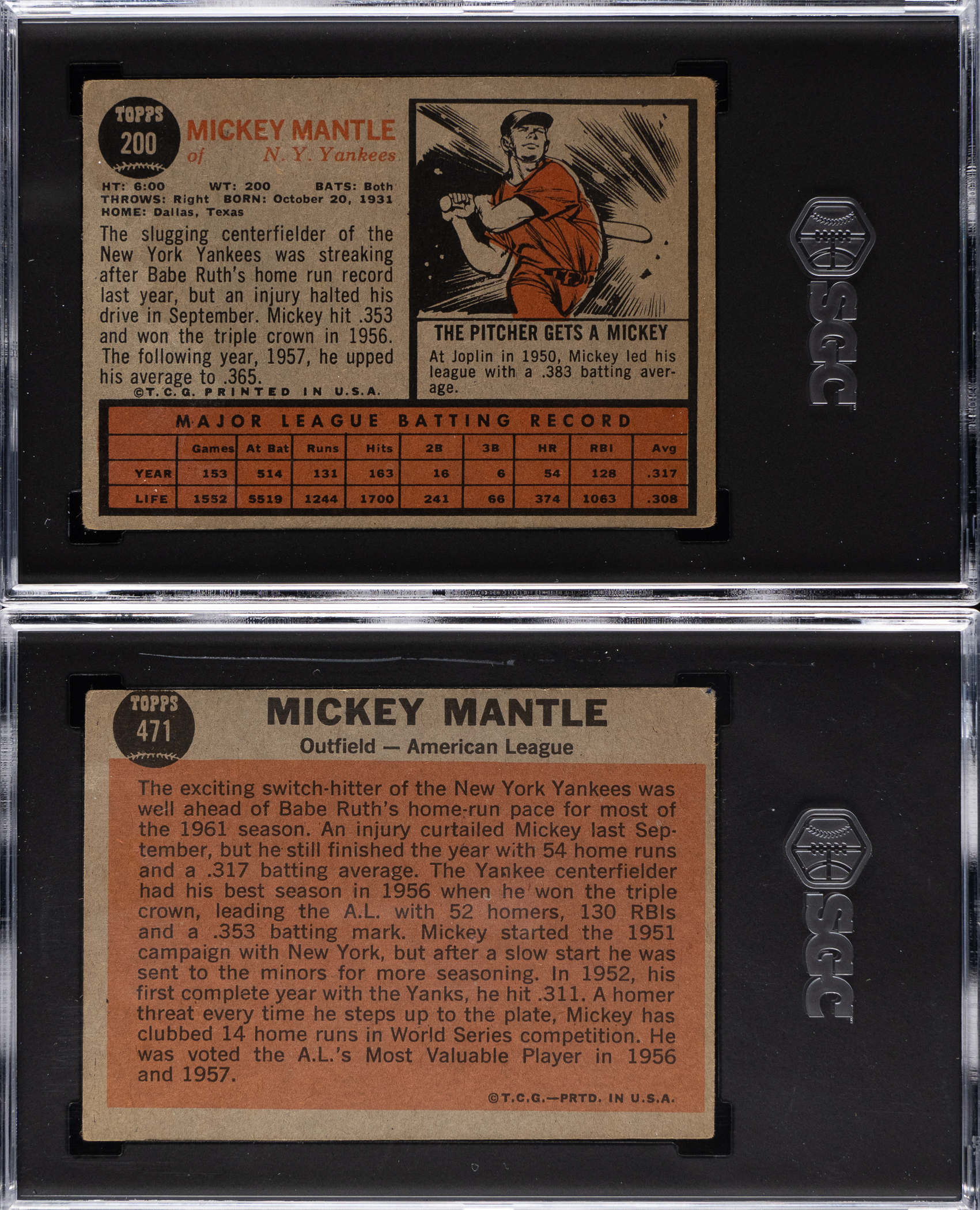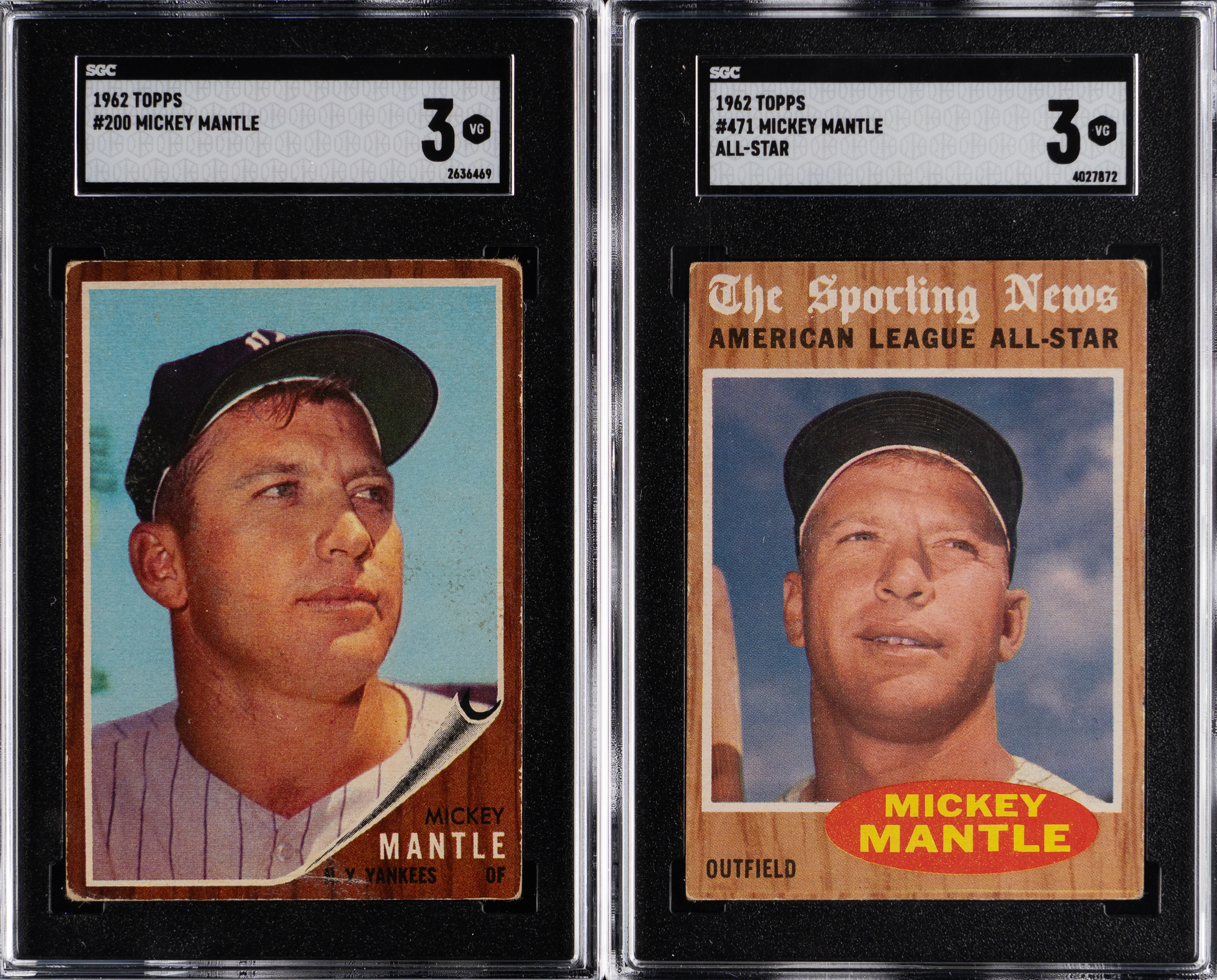 Each graded VG 3 by SGC. From the heyday of Mickey Mantle's offensive onslaught arrives the offered tandem of 1962 Topps gum cards. Includes: 1.) #200 base card and 2.) #471 All-Star specialty card.