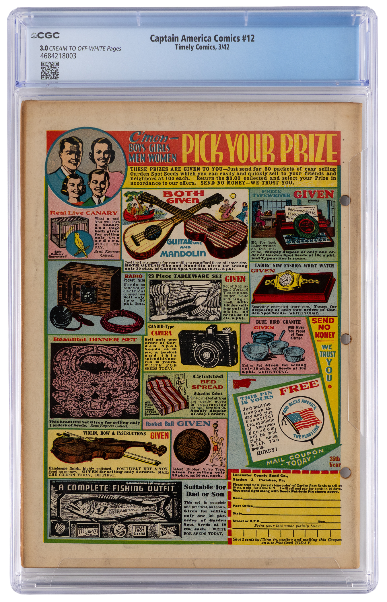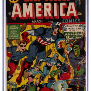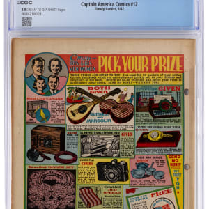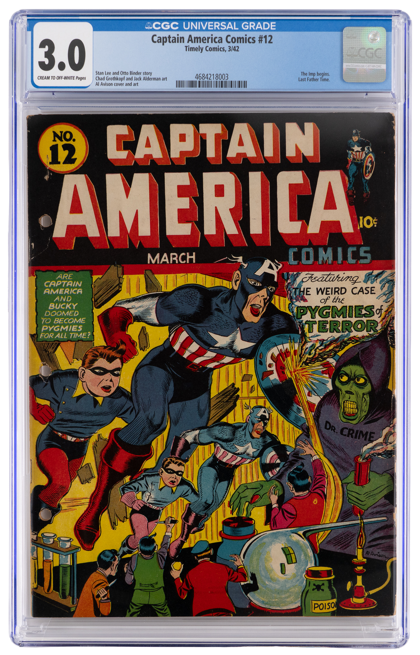Father Time says the clock is ticking, so get in on the action for this 3/42 Timely Comics Captain America Comics #12 issue. Actually, this issue is the last to feature Father Time. It also marks the beginning of the Imp. Throw in writing by Stan Lee and Otto Binder, plus art by Al Avison, and you have yourself a real winner here. CGC has furnished a grade of 3.0, Cream to Off-White Pages for this Golden Age treasure, which sports a green monster cooking up something evil of the front cover. Label notes are "Stan Lee and Otto Binder story, Chad Grothkopf and Jack Alderman art, Al Avison cover and art. The Imp begins. Last Father Time.".