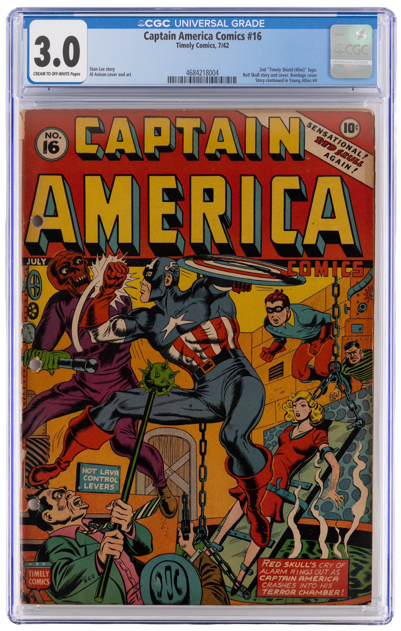 Evil takes it on the chin, in this 7/42 Timely Comics Captain America Comics #16 issue. Every comic book hero needs an archenemy, and Cap's shows up here, with a harrowing visit from the Red Skull. A nefarious Nazi, the Red Skull has relentlessly sought world domination since WWII, striking terror into the hearts of his intended victims. That is of course, until he has to face the good Captain. Al Avison's cover gives fans exactly what they need, with Captain America and Bucky coming to the rescue of a fair maid in bondage, who is facing death in a cauldron of hot lava. This high-profile wartime comic is encapsulated by CGC with a grade of 3.0, Cream to Off-White Pages. Label notes are "Stan Lee story, Al Avison cover and art. 2nd "Timely Shield (Mini)" logo. Red Skull story and cover. Bondage cover. Story continued in Young Allies #4.".