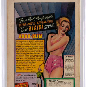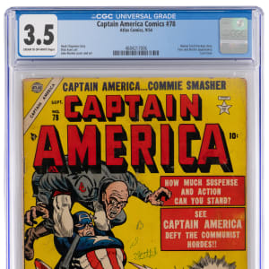 All good things must come to an end, and so it was with this 9/54 Atlas Comics Captain America Comics #78 issue. Founded under the Timely banner in 1941, this venerable title was put on pause in 1950 and then enjoyed a brief run under the publisher's rebranded Atlas banner in 1954. This #78 issue was the last one of the Golden Age run and Captain America wasn't seen again until ten years later, when he was thawed from the ice in Avengers #4, under the publisher's second rebranding as Marvel Comics. As a sign of the times, Cap was presented as "Captain America...Commie Smasher" in the 1954 revival, as seen on the header of the offered "Cold War" era issue. This nicely preserved example has earned a 3.5, Cream to Off-White Pages rating from CGC. Label notes are "Hank Chapman story, Dick Ayers art, John Romita cover and art. Human Torch backup story. Toro and Electro appearance. Last issue.".