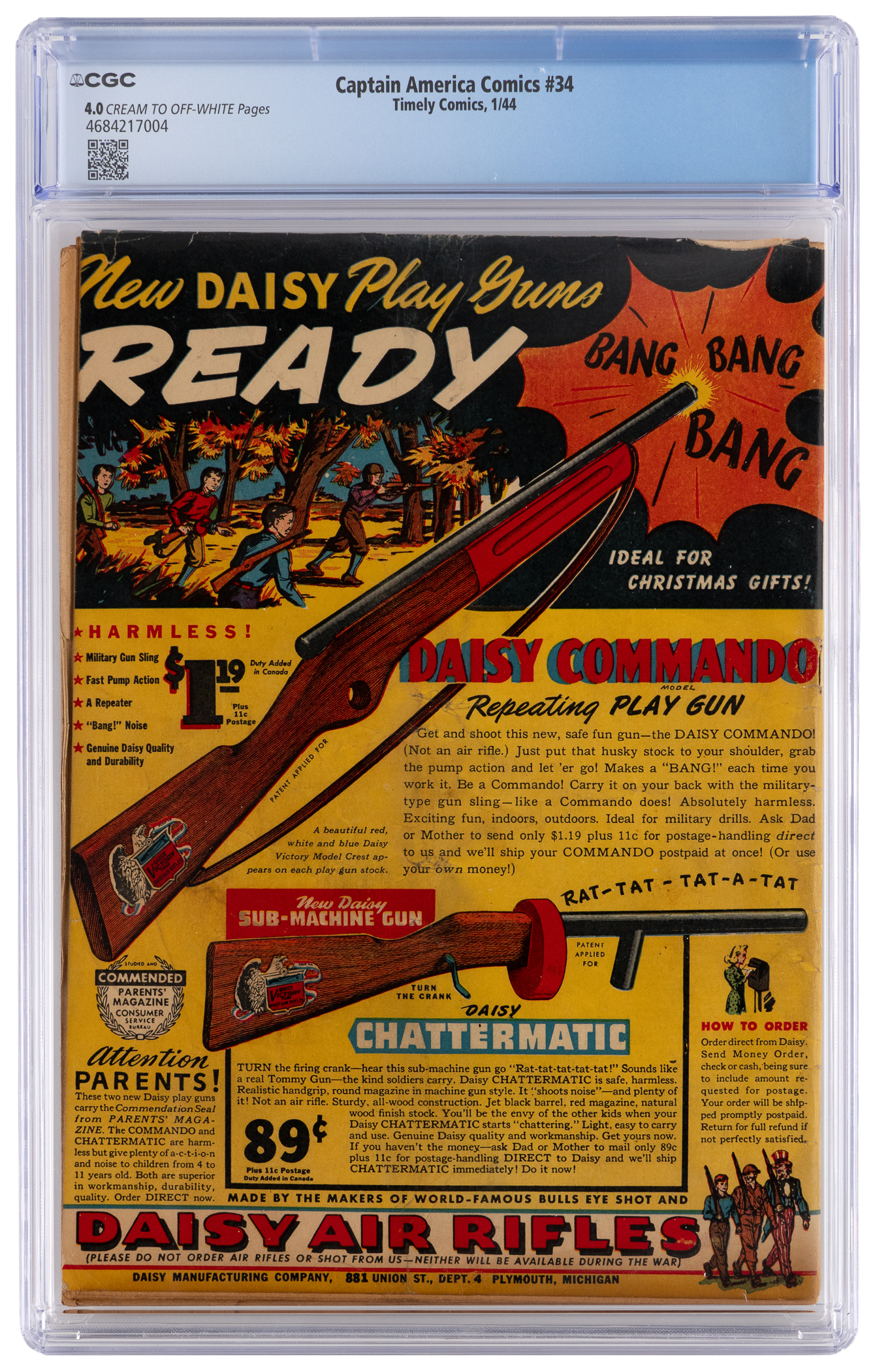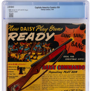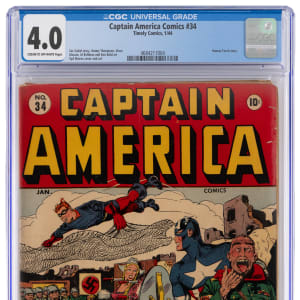 A classic from the Golden Age marches in, with the offering of this 1/44 Timely Comics Captain America Comics #34 issue. WWII was at a pivotal point at the time of publication, with the tide beginning to turn in the favor of the Allies. This straight to the point issue served up two of Timely's "Big Three" super-heroes doing battle, with Captain America in the main event, and the Human Torch is a back-up tale, a sweet "two-fer" if there ever was one. Adding great value is the front cover and interior artwork by the remarkable Syd Shores. CGC has graded this vintage treasure 4.0, Cream to Off-White Pages. Label notes are "Zac Gabel story, Jimmy Thompson, Vince Alascia, Al Bellman and Ken Bald art Syd Shores cover and art. Human Torch story."