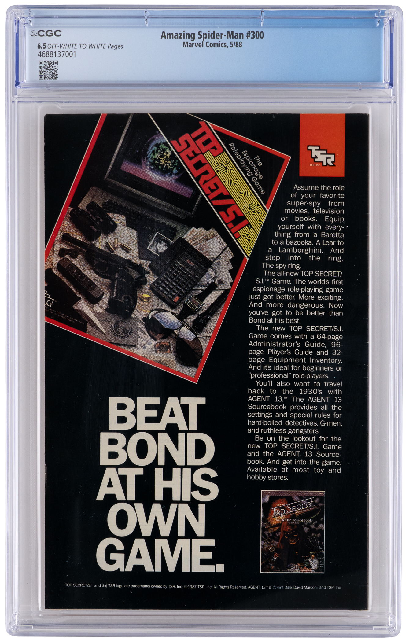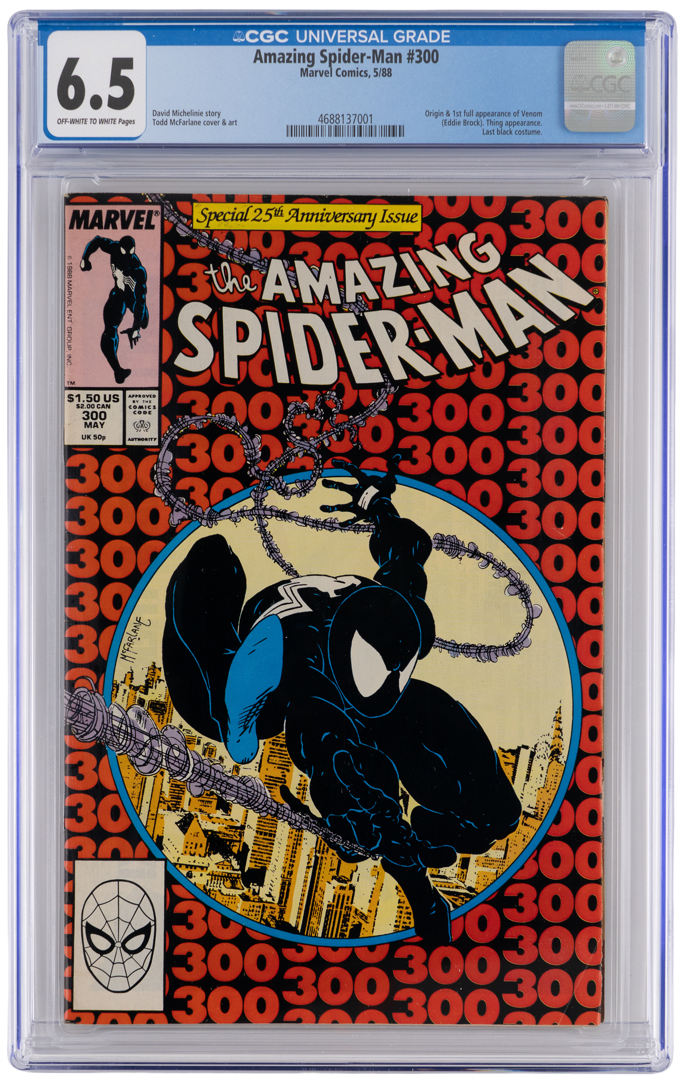 Heed the tingling of your Spider-Sense and take up the chase for this 5/88 Marvel Amazing Spider-Man #300 issue. One of the biggest key issues of the Copper Age, this thriller sees alien symbiote anti-hero Venom become more than just a suit, as makes his first full appearance. This classic tale also relates Venom's origin, and his bonding with Eddie Brock, who also makes his first full appearance. Todd McFarlane gets credit for the iconic cover and artwork, and David Michelinie wrote the entrancing story. CGC has encapsulated this coveted comic with a grade of 6.5, Off-White to White Pages. Label notes are "David Michelinie story, Todd McFarlane cover & art. Origin & 1st full appearance of Venom (Eddie Brock). Thing appearance. Last black costume.".