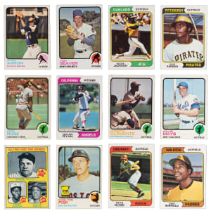 1974 Topps near: (654/660, average EX to EX-MT) with #1 Aaron (VG), #20 Ryan (VG), #80 Seaver (EX), #105 Fisk (VG-EX), #130 R. Jackson (EX-MT), #207 Ryan/Seaver LL (VG-EX), #252 Parker RC (EX), #283 Schmidt (PR, reverse writing), #300 Rose (VG), #340 Munson (EX-MT), #456 Winfield RC (EX-MT), #598 Griffey Sr. RC (VG-EX);