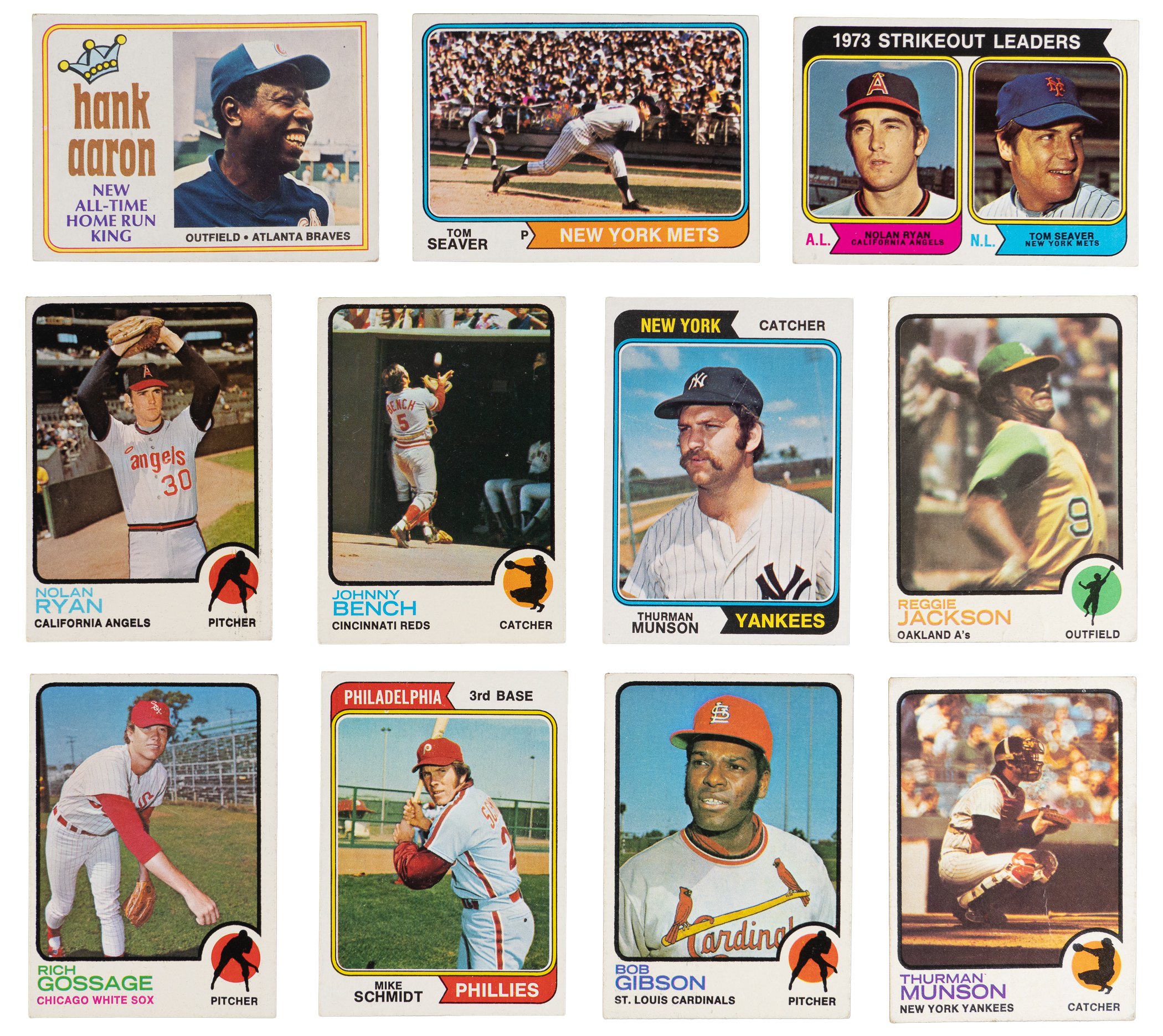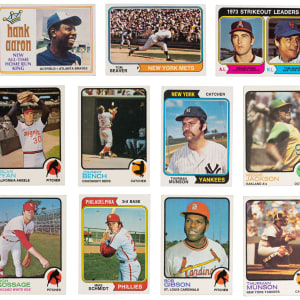 1973 Topps near: (633/660, average VG-EX to EX with nearly 5% displaying reverse paper loss or writing) with #1 Ruth/Aaron/Mays (GD), #50 Clemente (EX), #100 Aaron (EX-MT), #130 Rose (GD), #142 Munson (GD), #174 Gossage RC (FR, reverse writing), #190 Gibson (VG), #193 Fisk (VG-EX), #220 Ryan (PR, reverse writing), #245 Yastrzemski (VG), #255 R. Jackson (PR, reverse writing), #305 Mays (VG), #350 Seaver (EX), #380 Bench (VG-EX), #472 Gehrig LDR (PR, pin hole), #473 Aaron LDR (VG), #474 Ruth LDR (VG), #613 Boone RC (VG-EX), #614 Bumbry/Evans RC (GD);