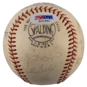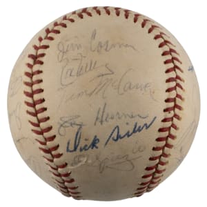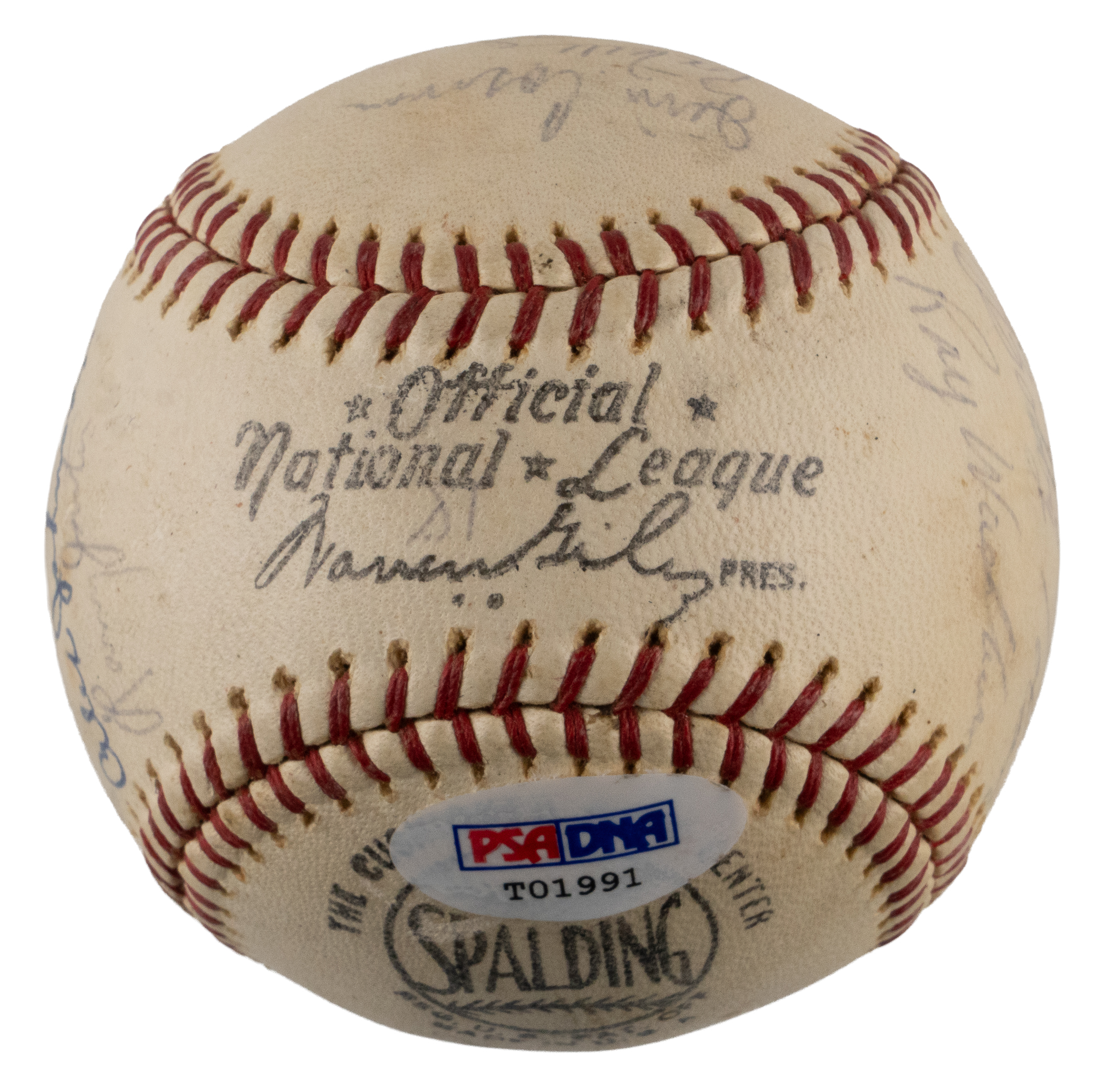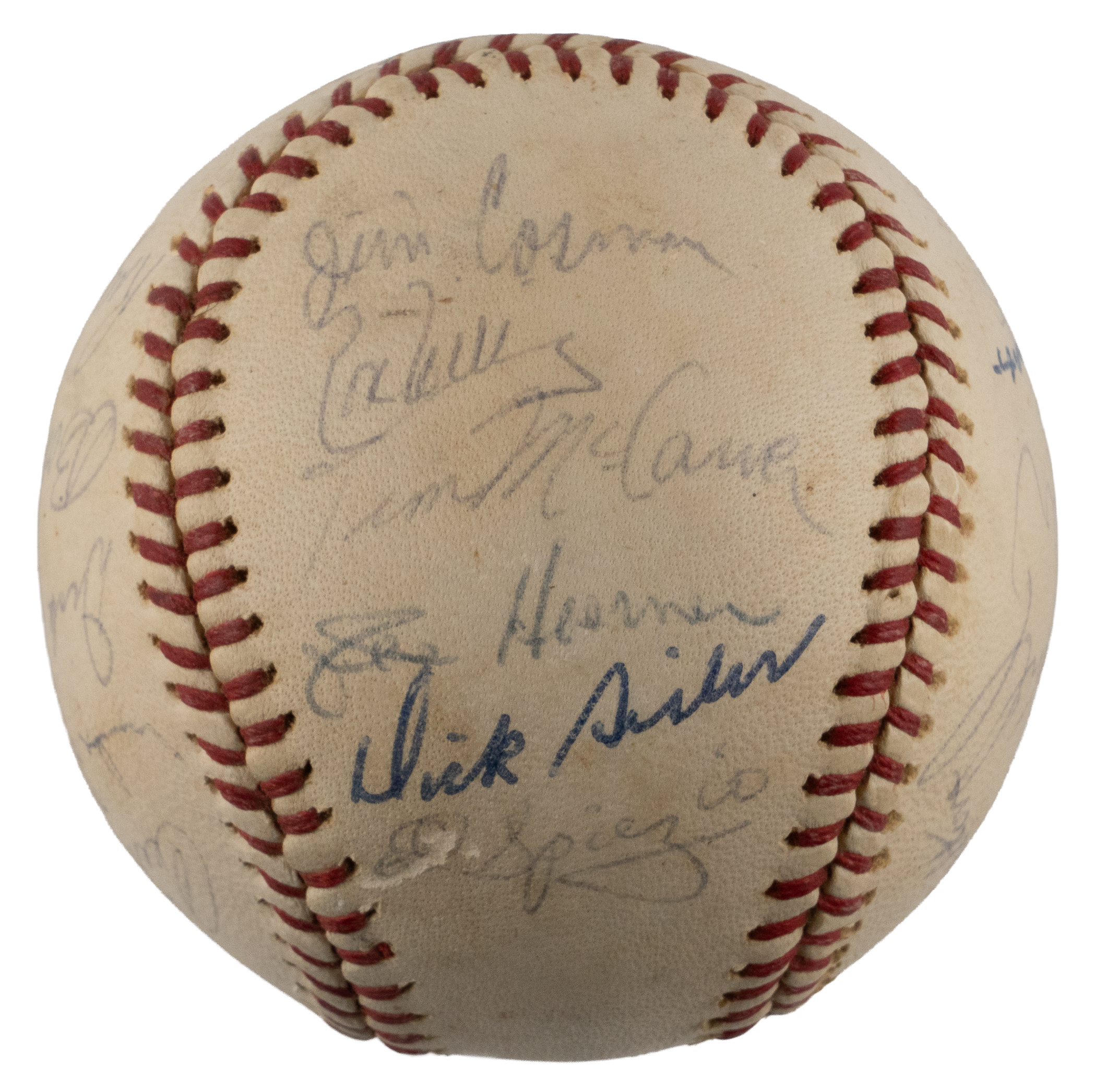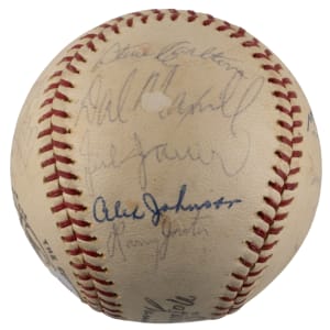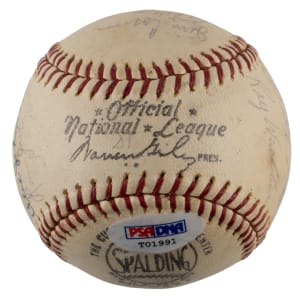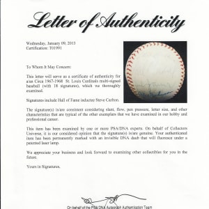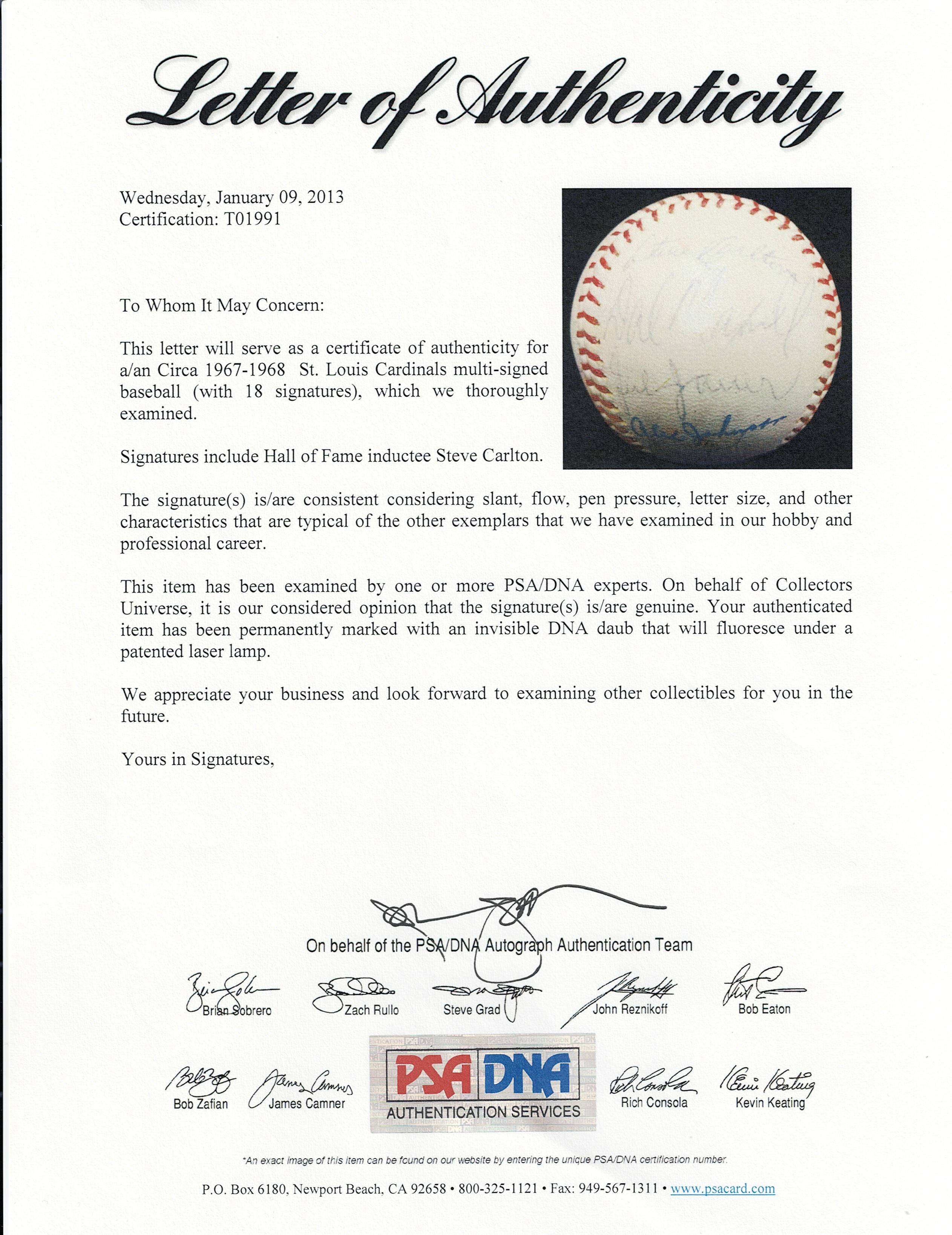 From the National League championship heyday of the St. Louis Cardinals franchise arrives the offered 1967-1968 St. Louis Cardinals team-signed ONL/Giles ball with (18) signatures. The sphere displays only a very thin coating of period shellac with minor chipping. The blue ink signatures generally present in the ("7-8") range with some better or lesser. Includes: West Panel: Cosman, Willis (d.1977), McCarver, Hoerner, D. Sisler, Spiezio; East Panel: unidentified, Briles; North Panel: Carlton, Maxvill, Javier, A. Johnson, Jaster; South Panel: Flood, Shannon, Hughes, Tolan and Washburn. Full LOA from PSA/DNA.