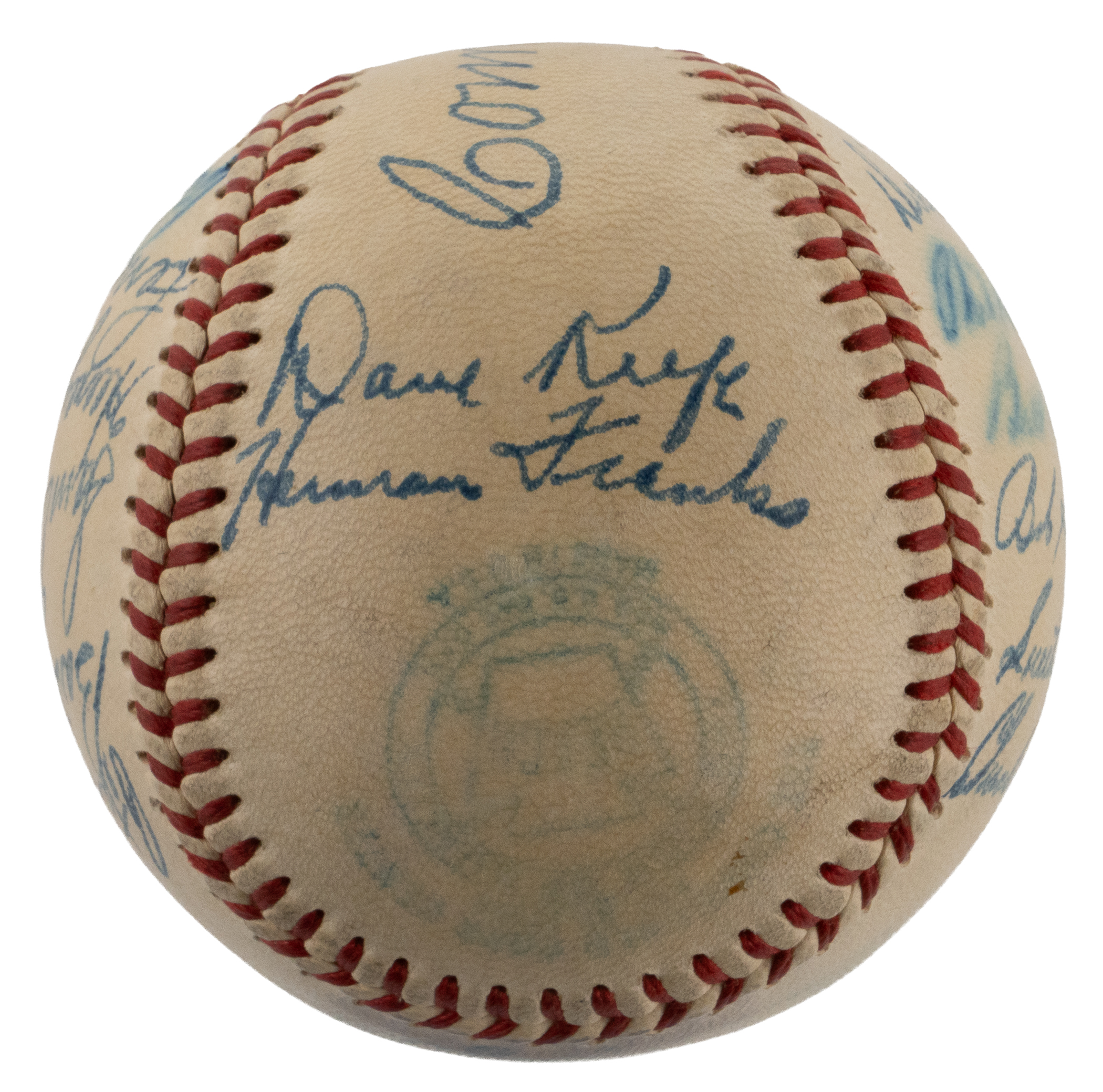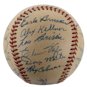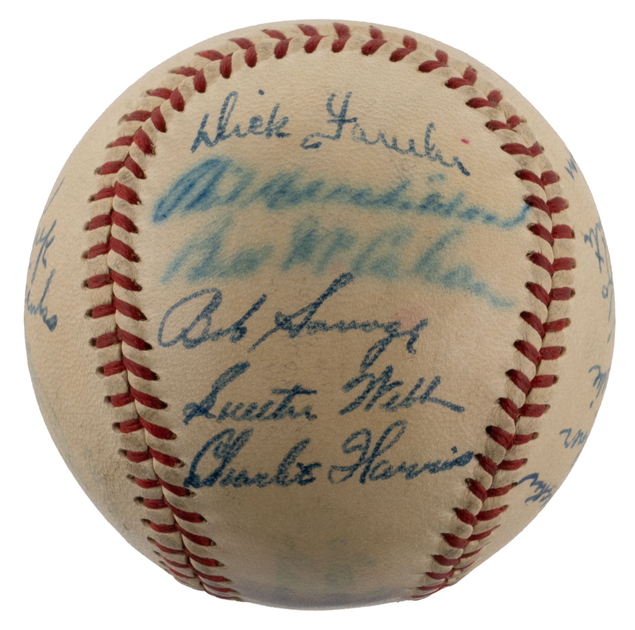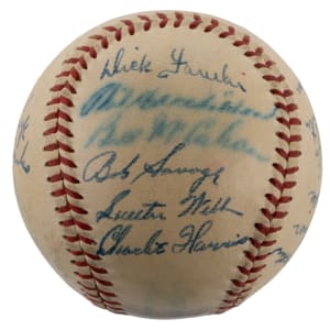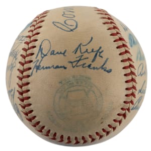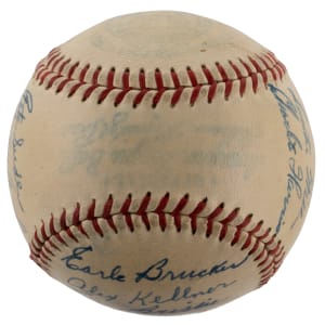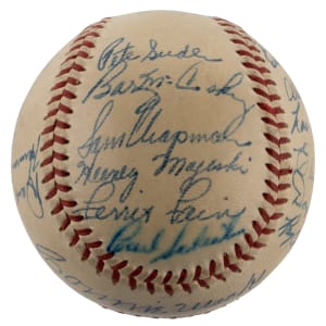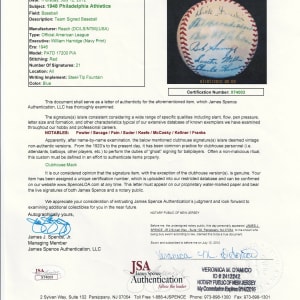For the first time in 15 seasons, the 1948 Philadelphia Athletics notched a winning record. The victorious squad penned this relatively clean OAL Harridge (Navy Print) ball with (21) signatures. The blue steel-tip fountain pen autographs are uniformly placed across the creamy panels. Includes: Sweet Spot: Mack (clubhouse); West Panel: D. Keefe, Franks; East Panel: Brucker Jr., Kellner, Brissie, Valo, D. White, Coleman; North Panel: Suder, McCoskey, S. Chapman, Majeski, Fain, Scheib; South Panel: Fowler, Marchildon, Wellman, Savage, S. Kell and C. Harris. Full LOA from James Spence/JSA.