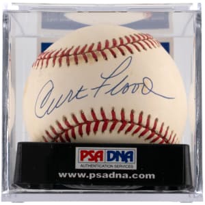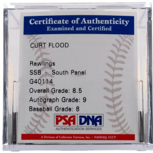 PSA/DNA graded 8.5 is an elusive Curt Flood single-signed baseball. Essentially blackballed for challenging baseball’s reserve clause, Flood paved the road to free agency, sacrificing his lucrative career in the process. Flood has signed boldly on the sweet spot of this ONL/White baseball.