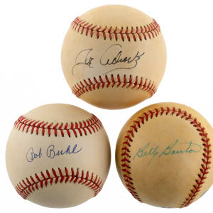 Those Milwaukee Braves stars who are uncommonly found on single-side balls defied the odds and penned the offered trio of ONL/OAL spheres. Despite varying degrees of toning throughout, the autographs are still quite bold with fine overall presentation. Includes: 1.) single-signed Adcock on sweet spot (ONL Feeney, full LOA from James Spence/JSA.); 2.) single-signed Bruton on south panel (OAL Mac Phail, James Spence/JSA sticker/cert card) and 3.) single-signed Buhl on sweet spot (ONL, James Spence/JSA sticker/cert card).