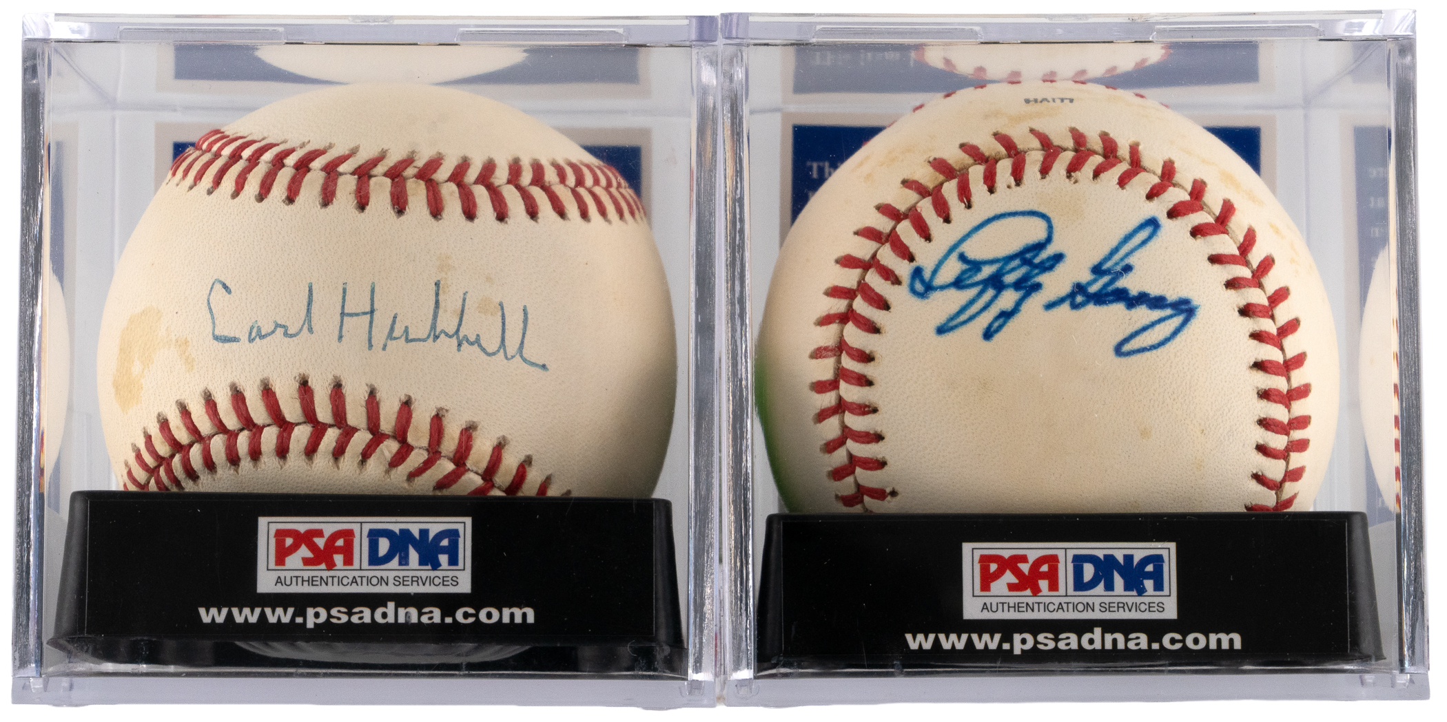 Each autograph judged Authentic by PSA/DNA and encapsulated by the service. Cross-league Hall of Fame aces have penned the the offered pair of single-signed Rawlings baseballs. Includes: 1.) Gomez on south panel with Autograph Grade: 8; Baseball Grade: 6; Overall Grade: 7; 2.) Hubbell on sweet spot with Autograph Grade: 7; Baseball Grade: 6 and Overall Grade: 6.5.
