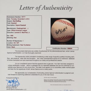 A cool blast from the past blows in, with this “Red” Ruffing single-signed baseball. When the New York Yankees went on a run of total domination, winning four consecutive World Series championships from 1936-1939, Ruffing anchored the pitching staff. During this stretch, the Hall of Fame hurler was a 20-game winner in each of the four seasons, to rank as the team’s winningest pitcher of the duration. Ruffing (d.1986) has signed on a side panel of an OAL/MacPhail baseball with moderately faded labeling stamps. Though Ruffing’s black fiber-tip marker signature shows a bit of ink migration, it remains very bold, with plenty of display appeal.